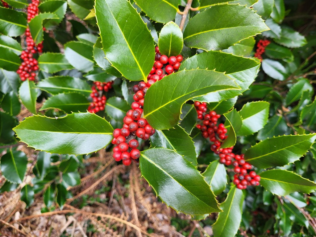Listings of winter color in the garden must include berries that ornament many hollies (below), but also evergreen needles and leaves. Many fade to the background as flowering trees and Japanese maples step forward into flower and leaf, but yellows and blues stand out in January.