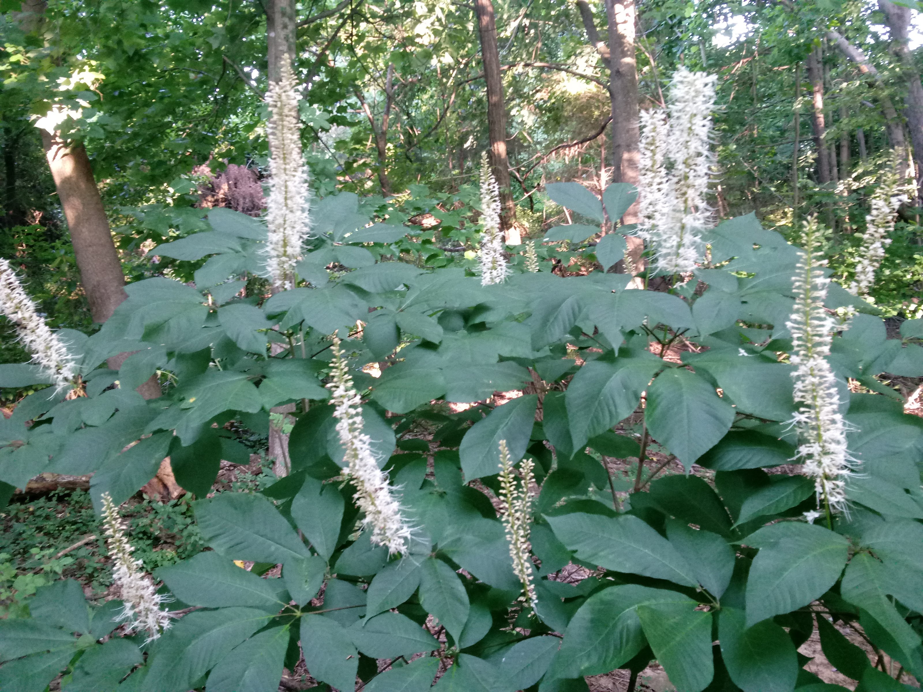 The last of the buckeyes to flower is the bottlebrush buckeye (Aesculus parvilfora, below) with white blooms in early summer. Earlier, I reported that this sprawling, well established shrub has grown branches along the soil that have now rooted. I haven’t a clue what took so long, and I will soon cut and transplant a few that are well rooted to spread them along this shaded border of the garden. With these new low branches the shrub has also grown substantially, further enclosing the garden so that while I’m within the rest of the world disappears from view.