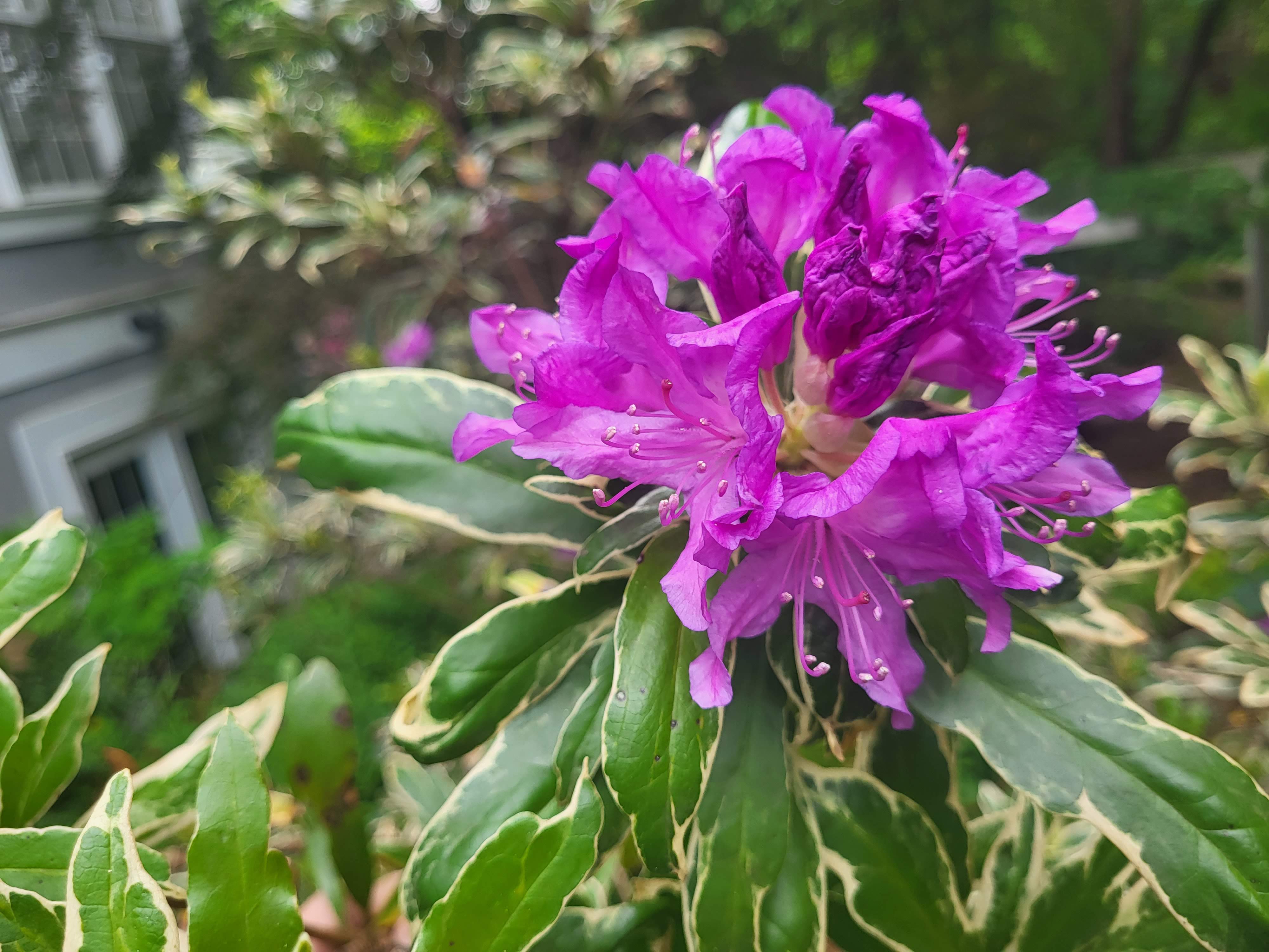 Trouble is brewing just outside our kitchen window. The assistant gardener (Barbara, my wife), who once was obsessed but now rarely chops leaves and fronds that cross the margins onto the stone paths, has taken a dislike to the tall, gangly ‘Silver Edge’ rhododendron (below) that is beginning to infringe on her view of the garden. A second ‘Silver Edge’ in the front garden grows more compactly, but this one sprawls in every direction.
