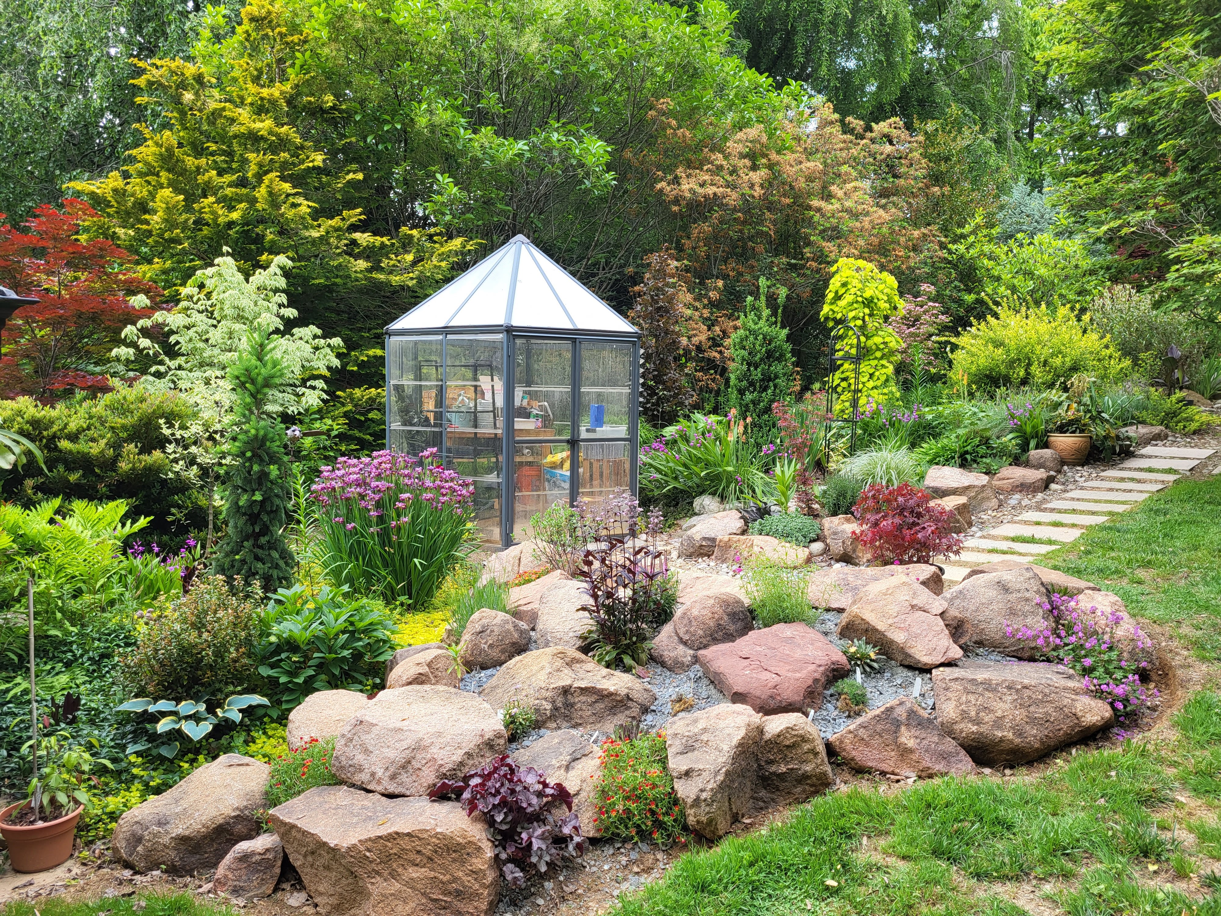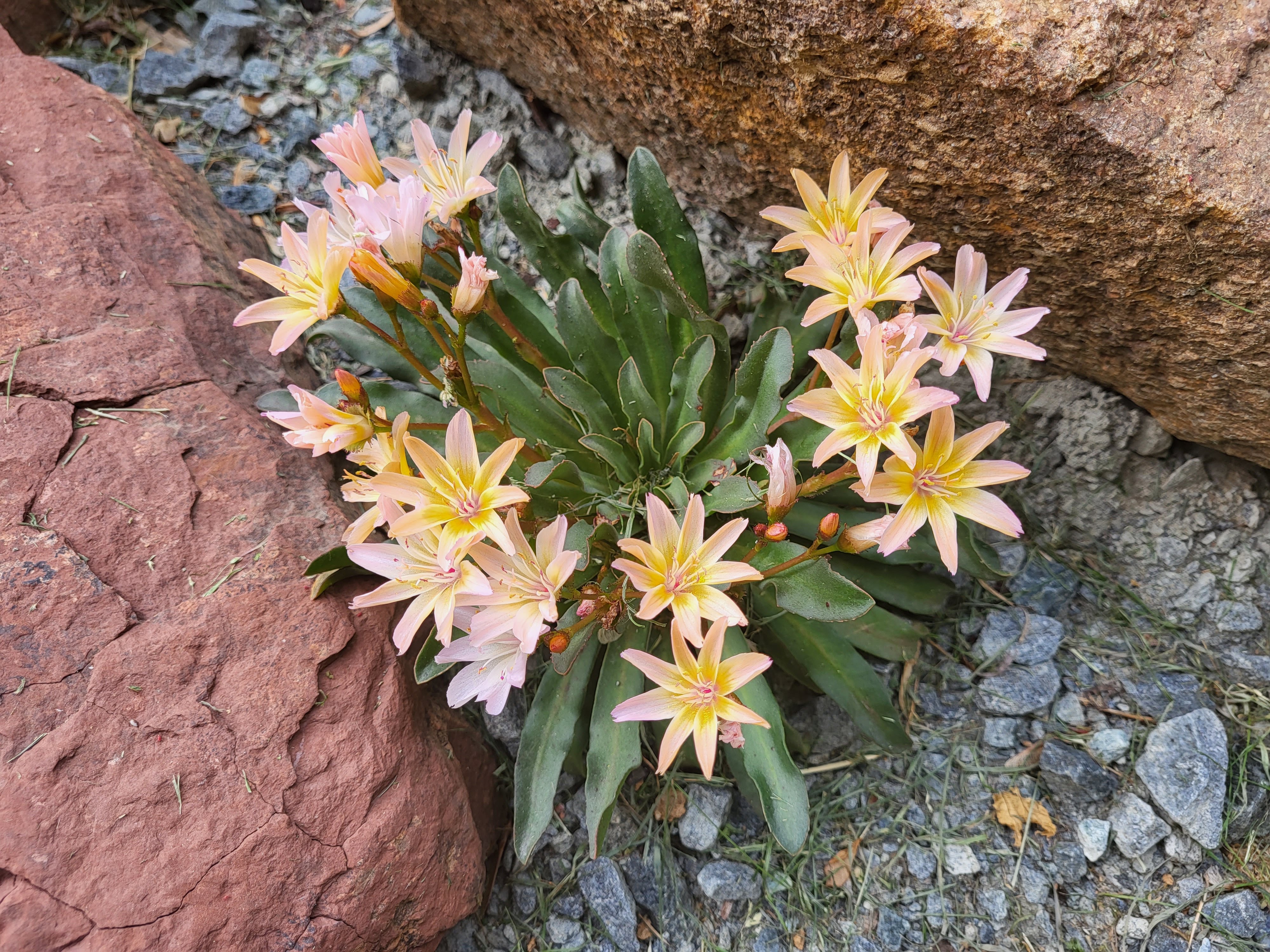 I was most concerned with how the newly planted rock garden (above and below) would fare through an extended dry period. The backfill between small boulders is only gravel and sand to encourage drainage, and until the newcomers grow deep roots they’re vulnerable to dryness. A few plants looked a little off, so I gave them a quick drink and everything’s good. The next day, I planted a few new arrivals that were ordered while traveling as I was inspired by plants growing in rock and gravel at high elevations on one of my hikes, with no concern that this early summer planting will be a problem.
