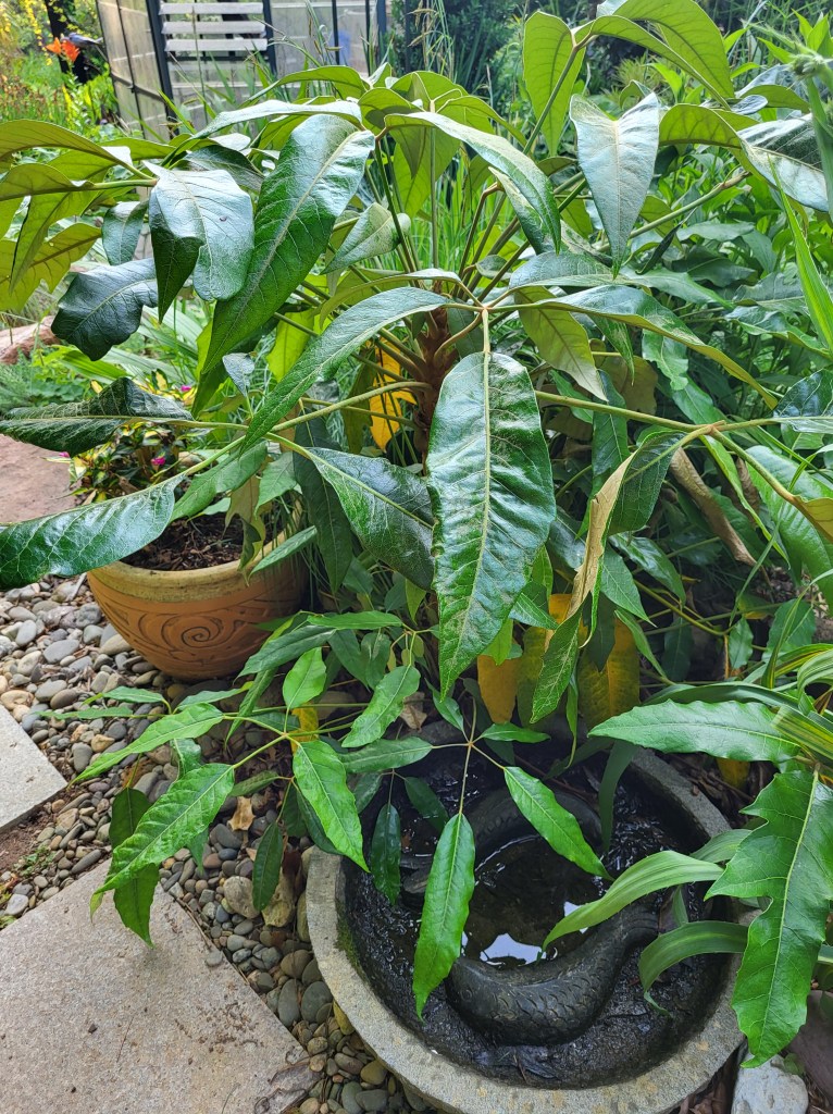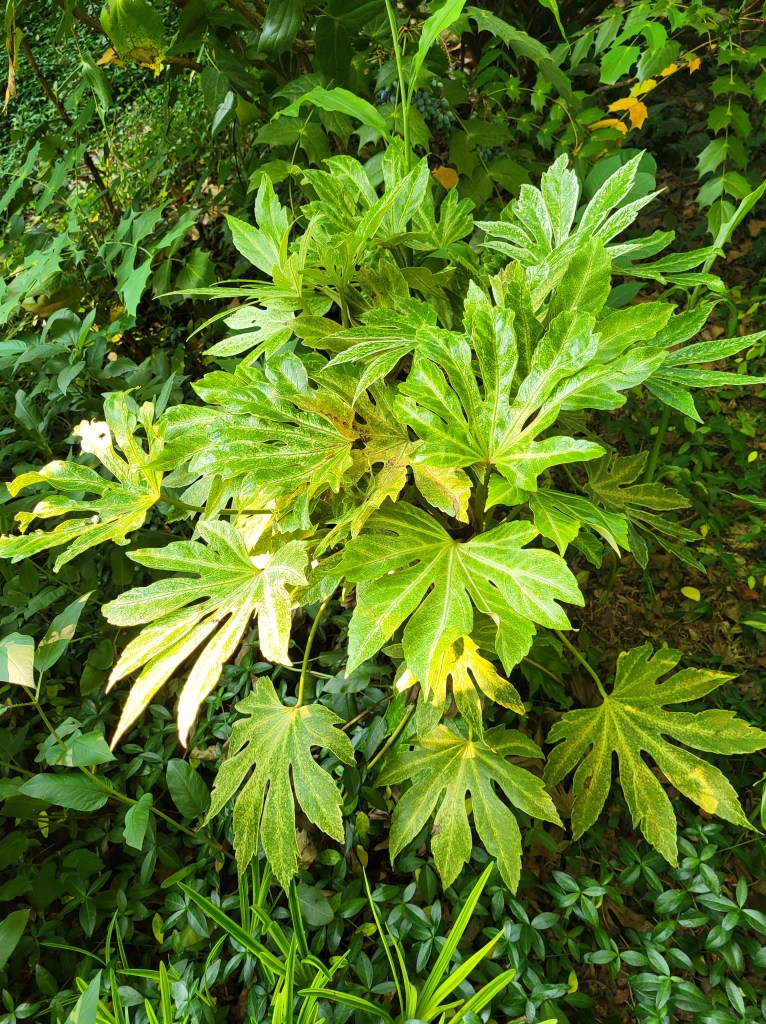 The abrupt drop in temperature did not bother the variegated ‘Spider’s Web’ fatsia (Fatsia japonica ‘Spider’s Web ‘, above) or the marginally cold tolerant Schefflera delavayi (below). The fatsia survives, though it does not thrive, while the schefflera is finally gaining the size to make me question its proximity to the primary path to the rear garden.