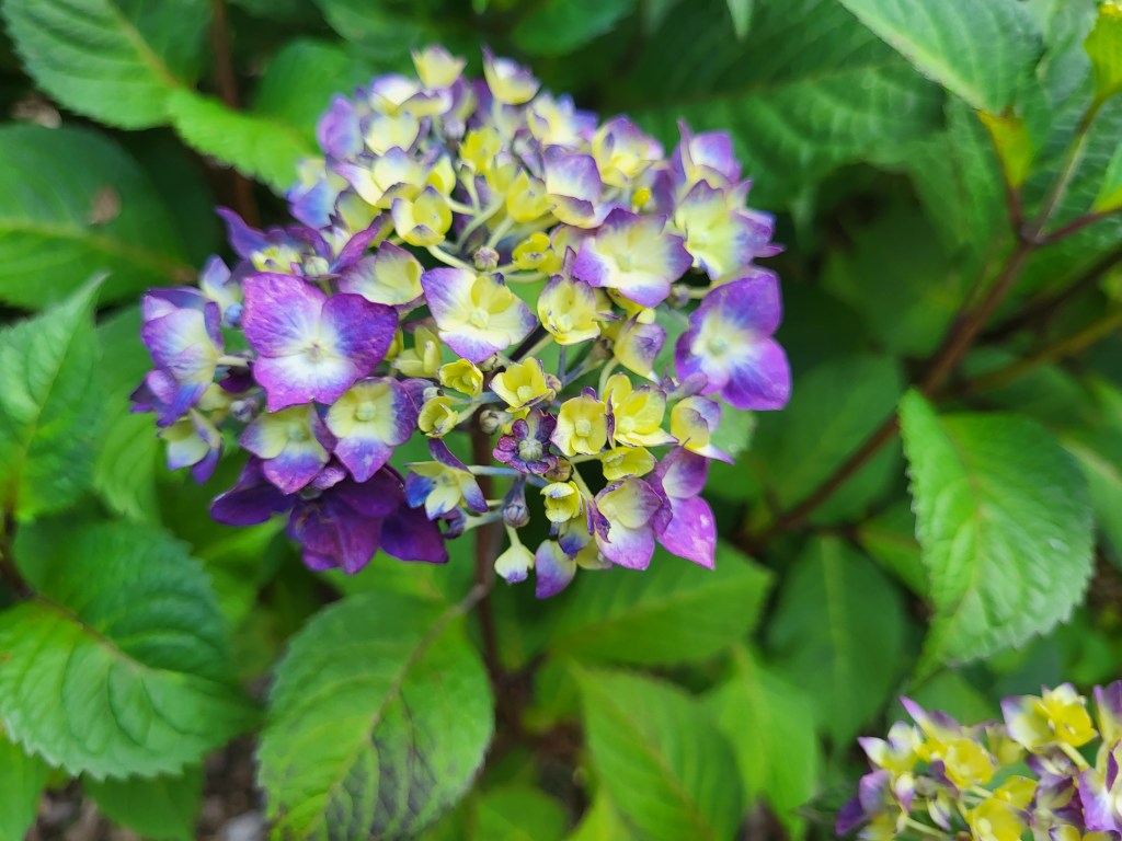 A drop to six degrees in December at least temporarily dispelled notions that our climate zone could fall another notch (once zone 6b, now 7a, soon 8a?), but still, bigleaf hydrangeas (Hydrangea macrophylla) were damaged by the abrupt fall in temperature. The last of non-remontant hydrangeas (flowering only on last year’s growth) will be dug out as soon as a suitable replacement is decided upon. Reblooming hydrangeas are now in glorious bloom (above) on buds developed this spring after the damaged stems were pruned away.