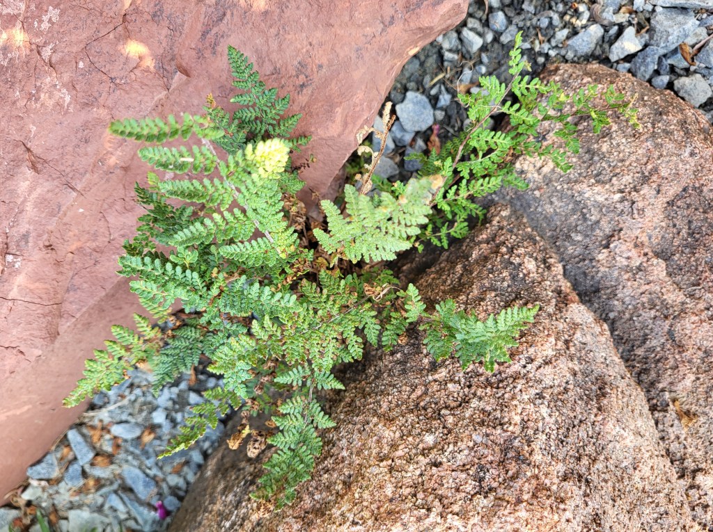 While not challenged by the cold, the wooly lipfern (Cheilanthes tomentosa, above) was a recent addition to the sunny rock garden. Our current dry spell has tested its resillience as it’s been rescued from the brink several times. Its fronds curl to play dead when dry, but I suspect the newly planted fern was revived at the last moment when I returned from ten days away.