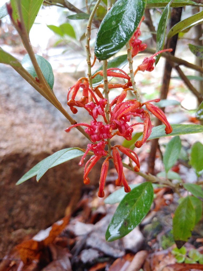 Flowering of the Australian native grevillea (Grevillea victories ‘Murray Valley Queen’, below) was cut short by falling temperatures the third week of December, but not a leaf was damaged as it sailed through six degrees, but an otherwise mild winter. It is also due for a chop before it grows to obstruct the path, but each year I become more confident in the long-term survival of these plants that I once considered tropicals. All were nearly cold hardy for the garden, but it seems now they are here to stay.