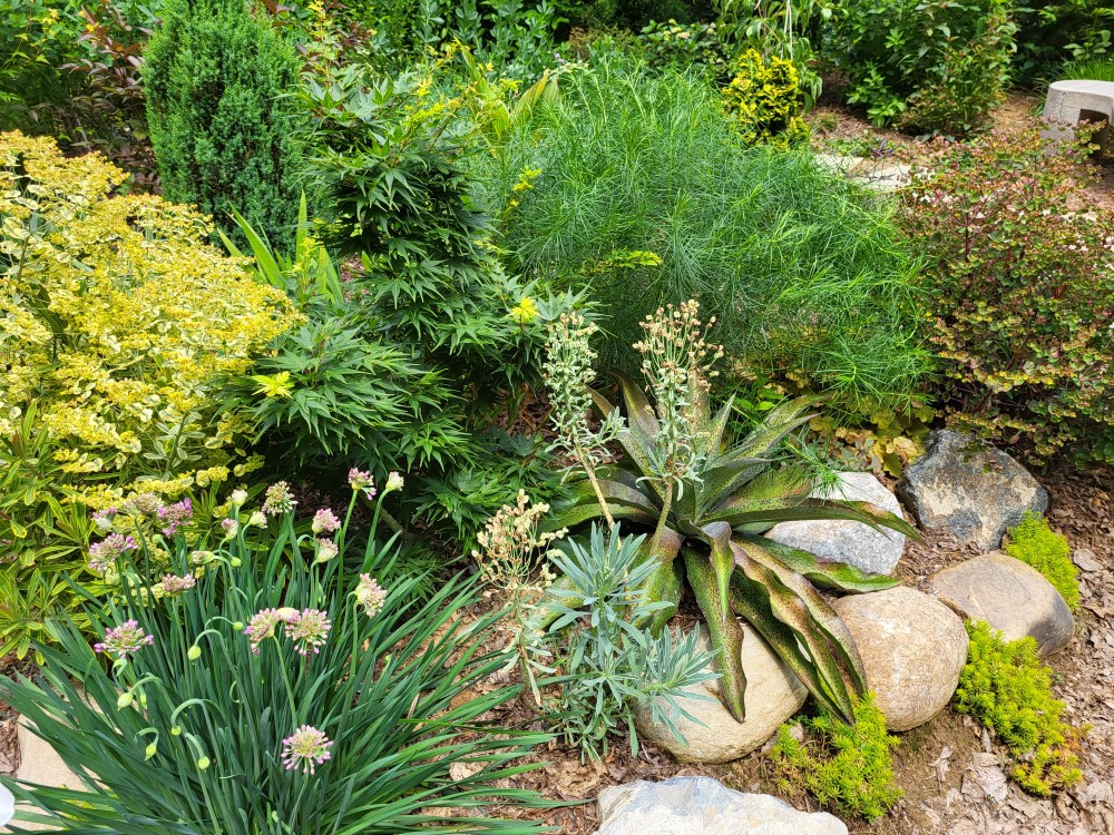 Tucked into the raised planting area in the lower, rear garden is a large mangave that is dug for the winter and stored in the basement along with several others. The crosses of agave and manfreda are variably cold hardy, but so far I don’t trust that any are sufficiently hardy enough to be left outdoors. While I’ve recently planted a manfreda that claims cold hardiness, I hope that our winters don’t change enough so that I’m comfortable leaving the mangaves outdoors.
