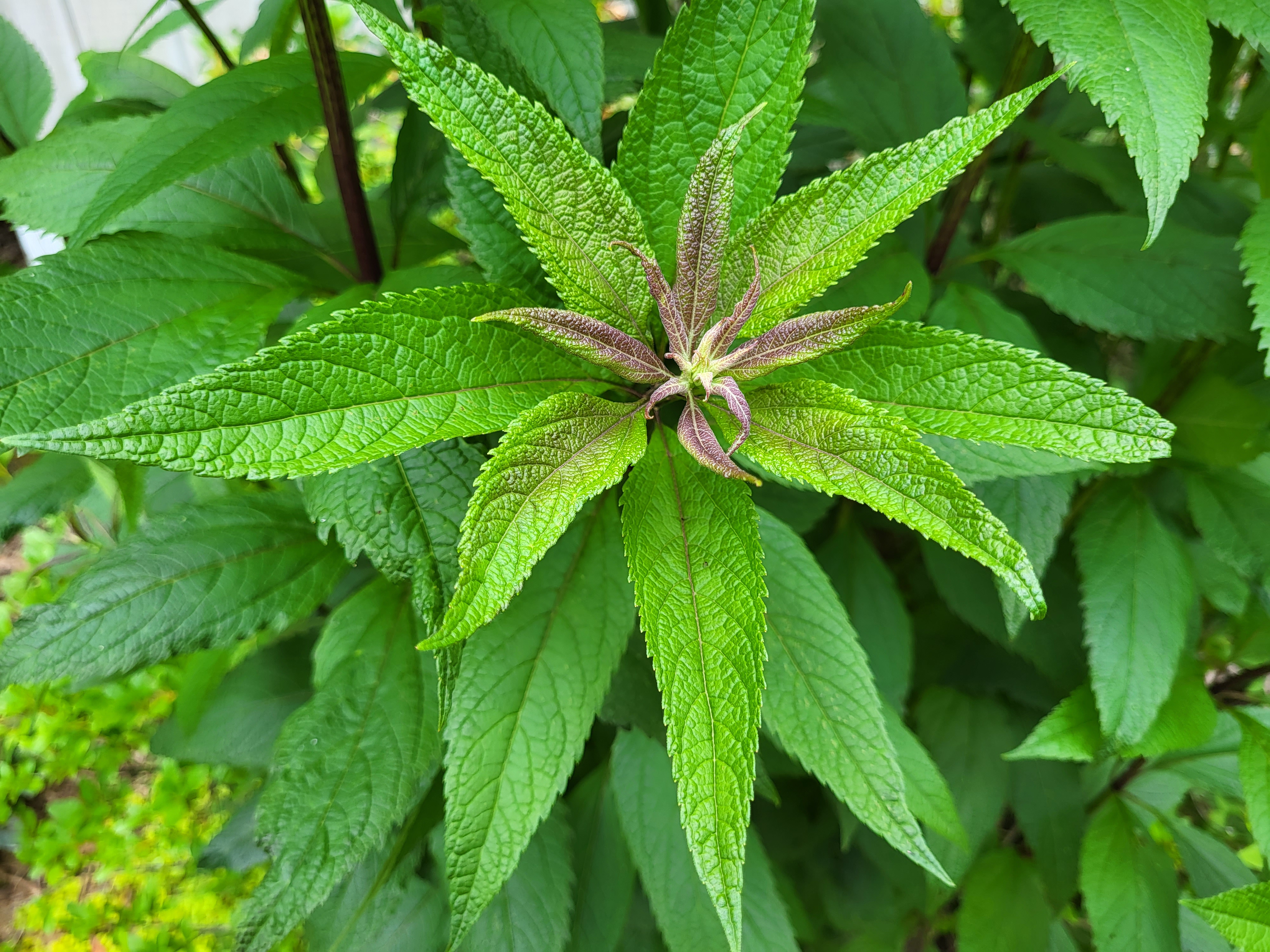 Seedlings of the native Joe Pye weed (Eutrochium purpureum, one Eupatorium, below) pop up regularly in the damp, lower rear garden, sometimes in the middle of another shrub where they must be weeded out. I leave as many as possible, though they grow quite, since the swallowtails love their late summer flowers.
