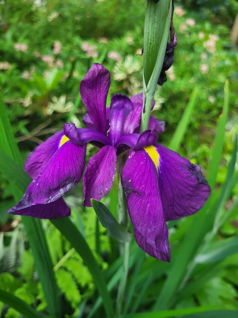I was surprised a few years ago when a Japanese iris (Iris ensata, below) popped up just below our kitchen window. Even when it’s not flowering the upright leaves stand above the surrounding foliage. The nearest irises are halfway down the rear garden, so I have no clue how this one got its start, but I’m happy to have it. I could do without the many thousands of maple seedlings that sprout in the garden from swamp maples that border the garden, but many seedlings are welcome.