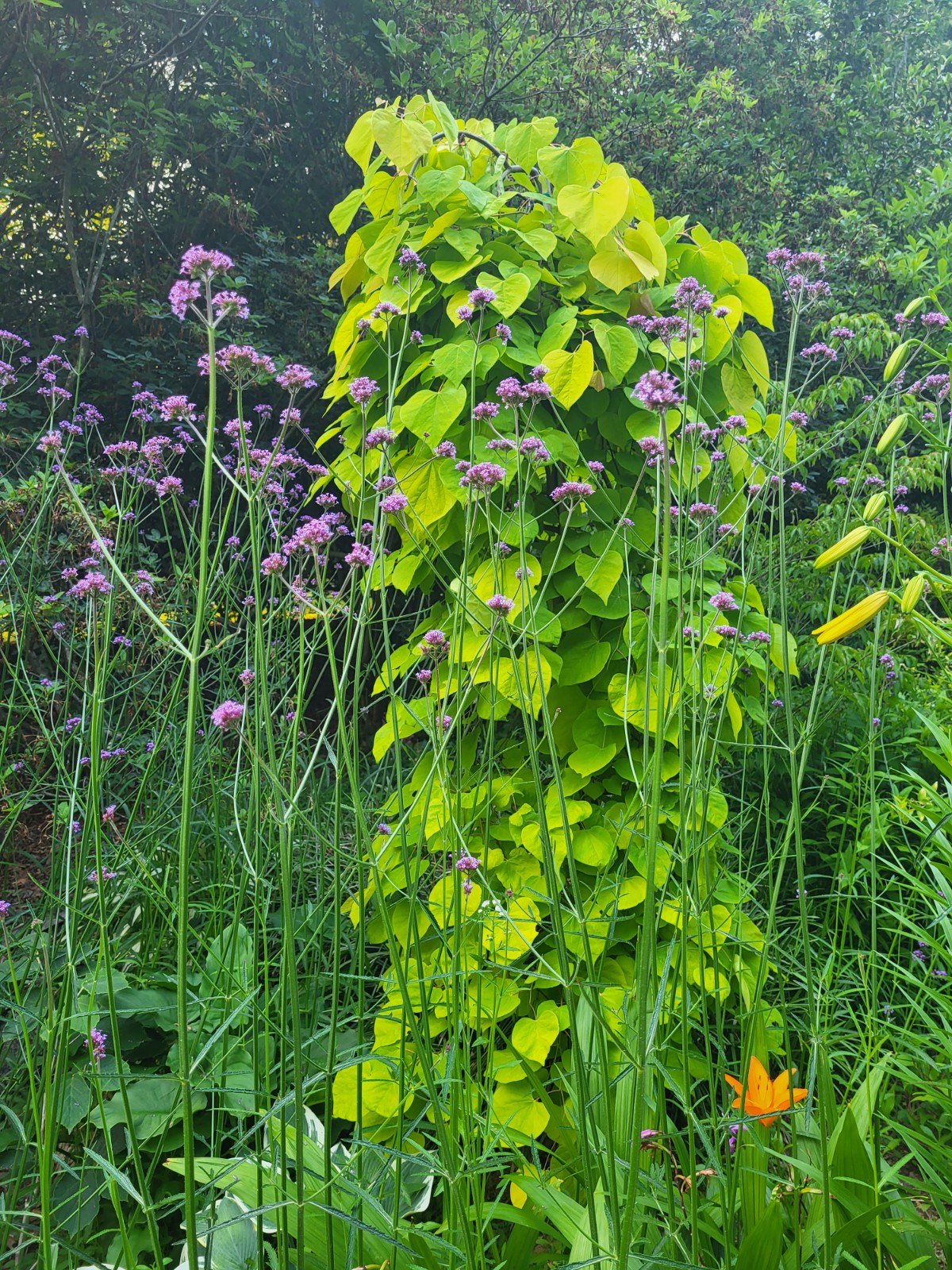 As is often the case, the best plant combinations in the garden are complete accidents. Japanese Painted ferns pop up in the best places, and today, the most notable accident is the multitude of seedlings of Verbena bonariensis (below) that stand tall and purple in front of the bright yellow ‘Golden Falls’ redbud. The verbena seedlings cover every inch of open soil, and many are weeded out or trampled as I get around the garden. Who cares? There are hundreds, but the tall, narrow perennials are see throughs, so while they add color they don’t block a thing.
