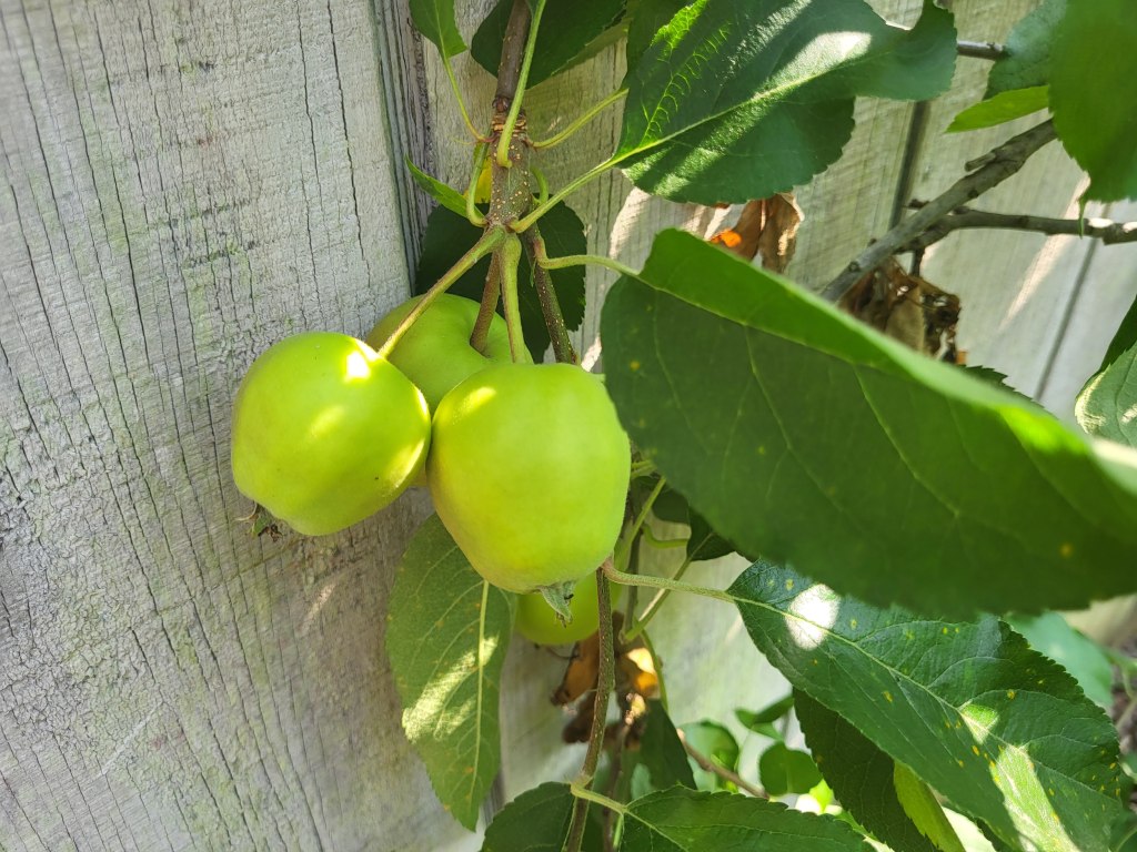 I notice several bunches of apples on the espalier on the shed wall (above). They’re still small, but I expect again that deer will get to them before I do. No matter, I wanted an espalier and didn’t care what it was, so I never really planned on eating the apples. I rarely eat more than a few handfuls of blueberries from the huge bushes at the rear of the garden, leaving them for the birds since I can reach only the lower half. People who grow apples tell me they must be sprayed to keep the worms out, but of course I don’t and the deer don’t complain.