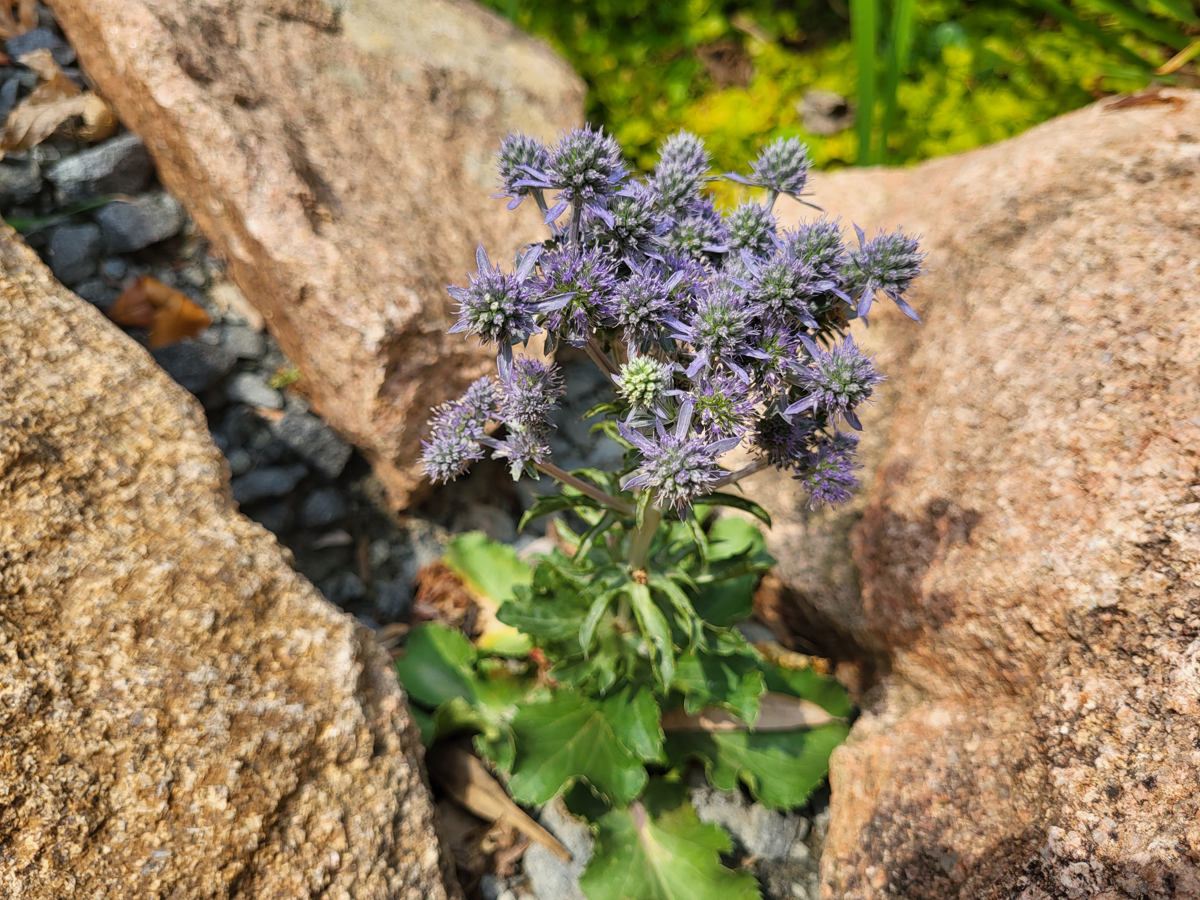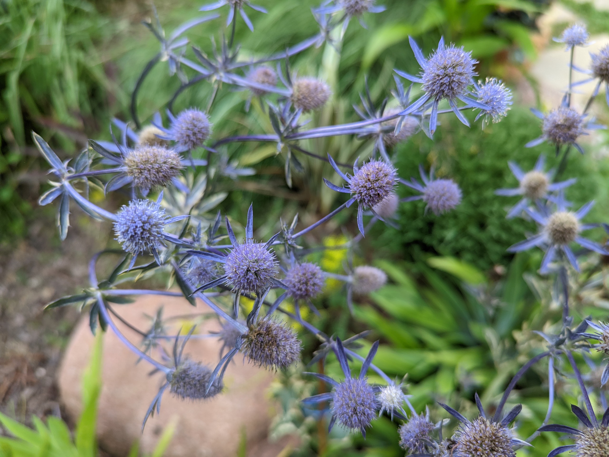 Happily, the various sea hollies (Eryngium) have adapted well to well drained soils, including a tiny one in the gravel based rock garden (above). Happiest, is the tall growing Rattlesnake master (Eryngium yuccifolium, below), with one growing to four feet and the other over six. Both tend to flop a bit, so they require some support. These are not refined, mannerly plants, but neither is this garden.
