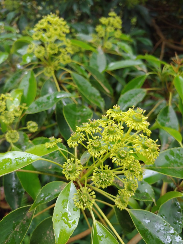 Today, I wonder why the Wheel tree (Trochodendron aralioides, below) has skipped a year in bloom. It’s alive and healthy, and yes, I’m aware that many factors play into the lack of flowers. Deer nibbling branch tips of a third of the shrubby tree certainly decreased the quantity of potential buds. But, what happened to the branch tips not chewed?