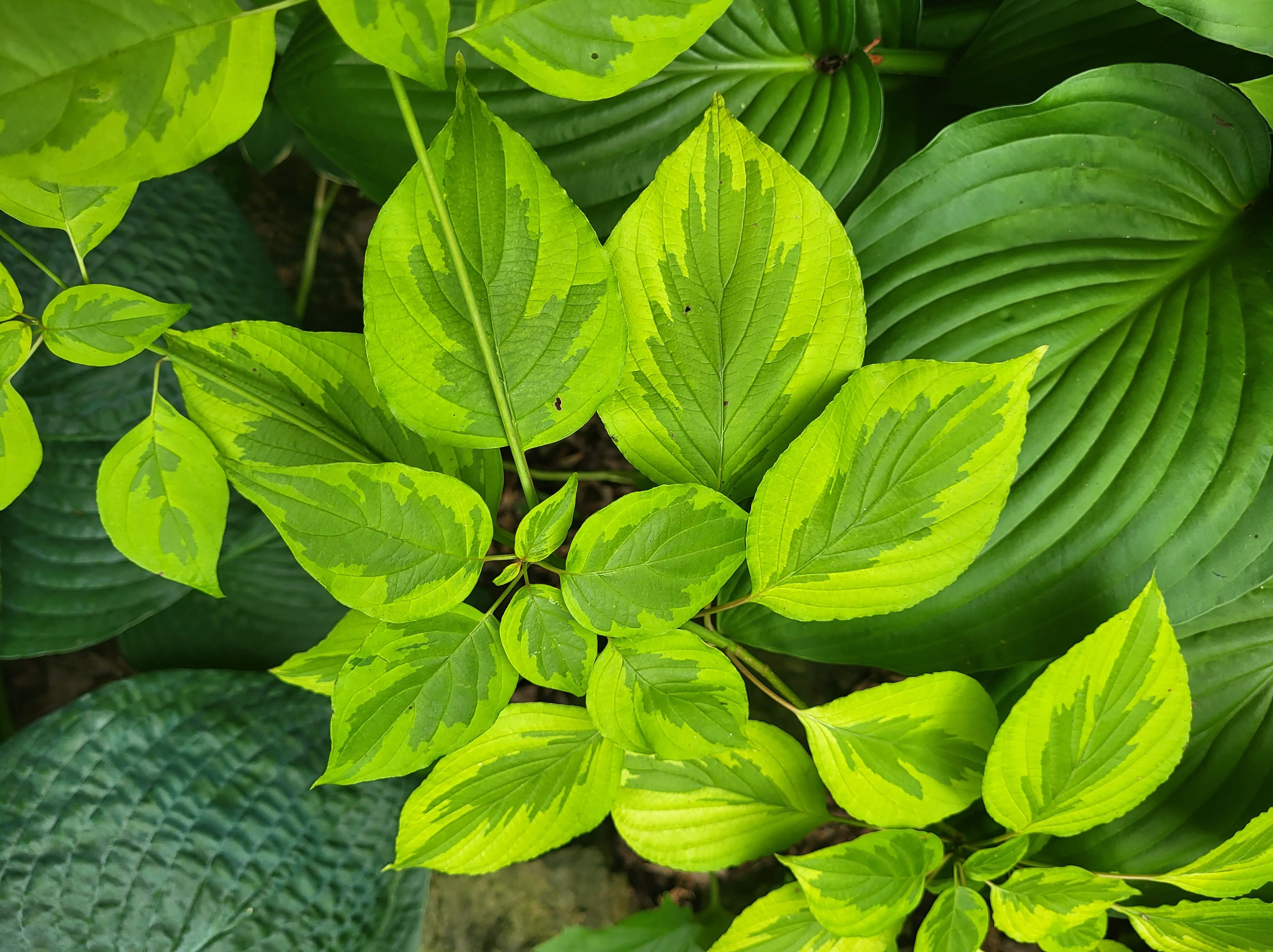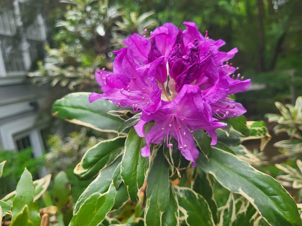 Today, a taller than expected, variegated rhododendron (‘Silver Edge’, above) encroaches on the view from the kitchen, with the Wheel tree slowly heading towards the same. After a first year with negligible growth, a yellow variegated Pagoda dogwood (Cornus alternifolia Golden Shadows, below) has grown remarkably. It will also obstruct the view. Now, perhaps within my lifetime.