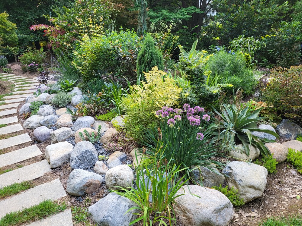 It will be a few years before several Japanese maples in this area grow up to show up, but there’s enough other stuff that the planting looks like my typical jumble of shrubs with perennials jammed into the margins.