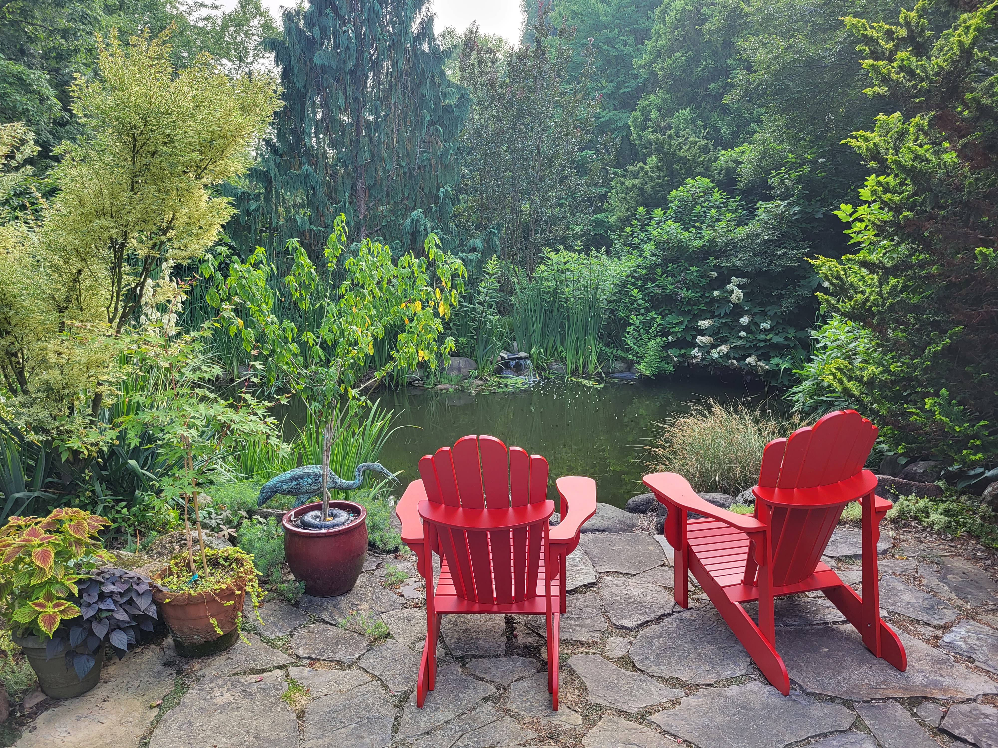 I enjoy your photos and posts. Question, what is the name of the evergreen in the photo with the two red chairs. It is directly above (in photo) the red pot? It has “drooping” needles (kind of).