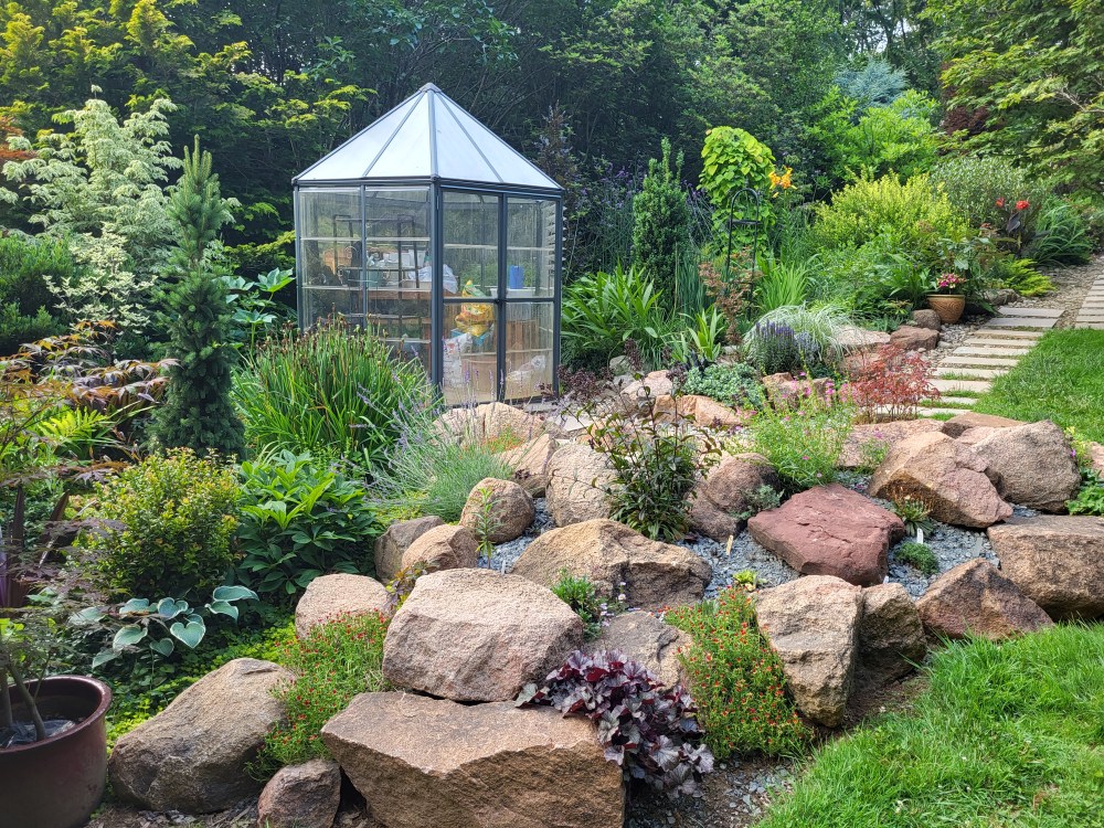 Besides wondering why someone would include five ponds and countless tons of boulders in a garden, visitors often are surprised that one thing and another has grown so large. After thirty-four years, most everything has grown larger than the mature size stated by references. Who would guess that a spruce most consider to be a dwarf (Picea glauca ‘Globosa’) could grow to ten feet in height and width? And a gold threadbranch cypress (Chamaecyparis pisifera ‘Filifera Aurea’) thirty feet tall? Visitors are likely to second guess much of their garden after seeing this. I’ve learned from visiting other gardens, and a visitor to this one might learn a thing or two.