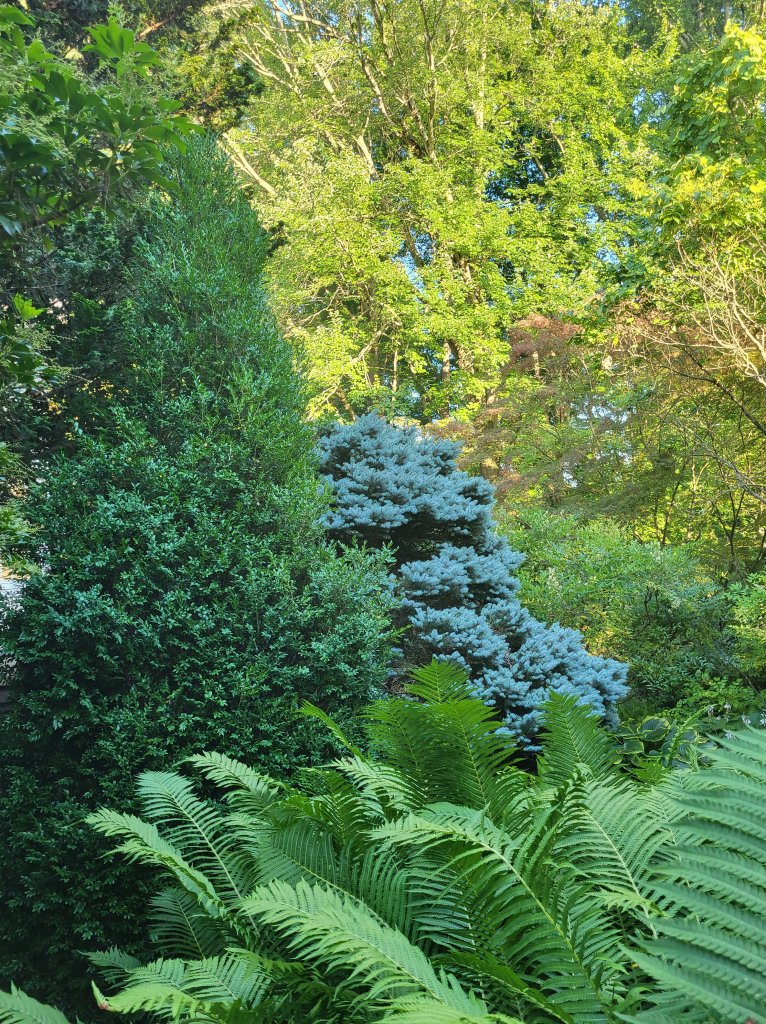 No doubt, this garden will never be manicured (above). There’s a single boxwood (below) that long ago encroached on a path and patio that I decided to trim into a cone rather than dig it out. It’s now about twelve feet tall, and it hasn’t been sheared in several years though it retains the semi-conical look. Little else is pruned or sheared unless a branch strays too far to obstruct a path.