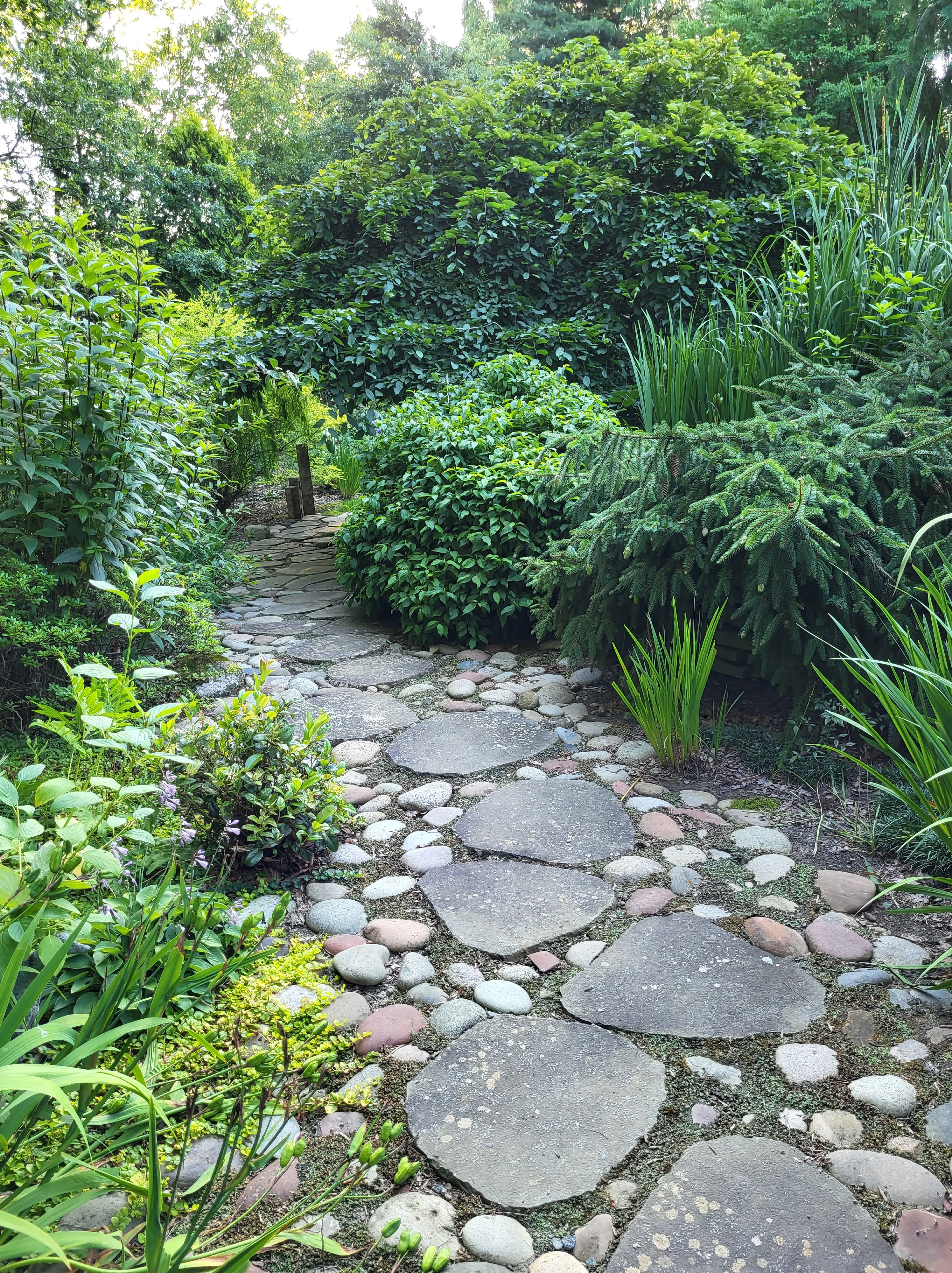 Of course, walking the garden is also slowed by the irregular footing, wobbly path stones and changes from cut paving to natural stones that must be traveled with care. Recent visitors noted the lack of continuity in the paths with five small patios, all constructed with different materials. All are natural stone, but none match. Several paths switch from one stone to another midway. Some might be bothered by this. Not me.