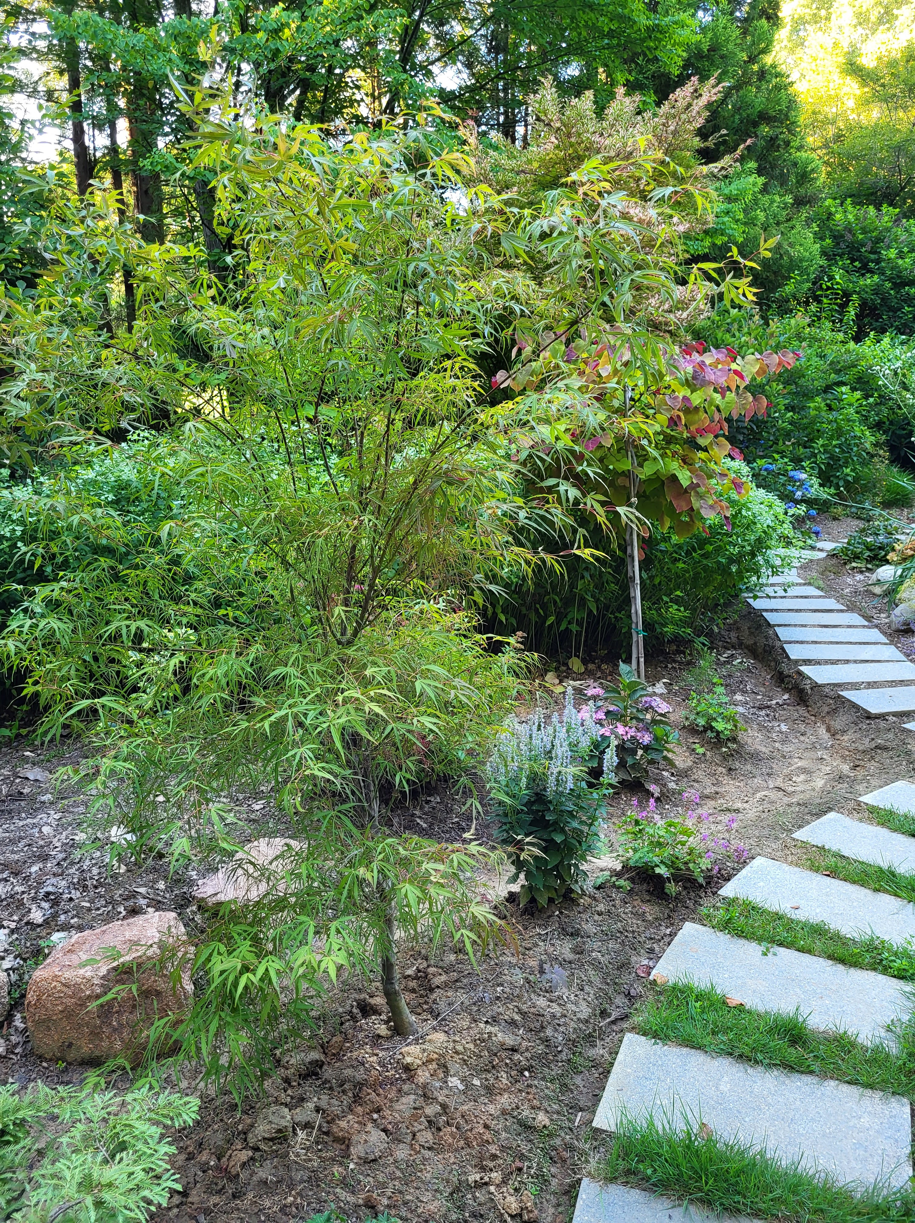 Today, there’s much to do, but no rush in summer’s heat. I’ve just finished planting a few Japanese maples and a dwarf Dawn Redwood (Metasequoia glyptostroboides ‘Miss Grace’), and filled gaps in between with a few perennials. There are still maple seedlings to pull, and by early summer there are plenty of perennials beginning to flop. A few have been braced with supports so they don’t injure a dwarf ginkgo and other neighbors, but I don’t have the number of supports or the inclination to address all the floppers. This is not a bother.