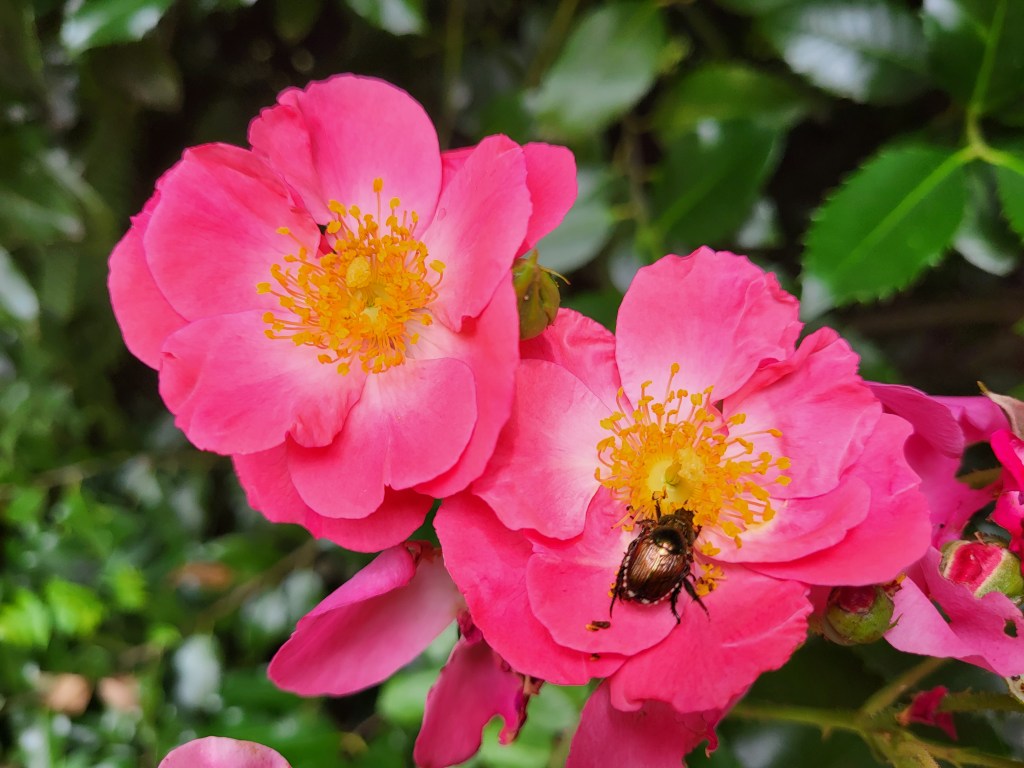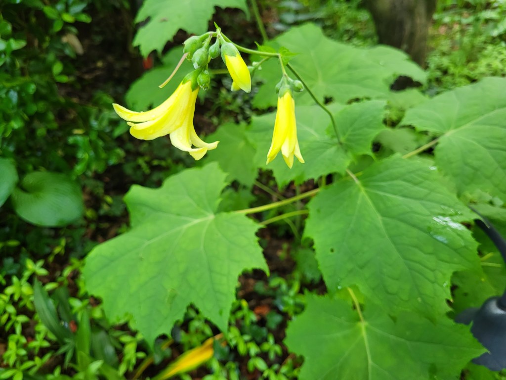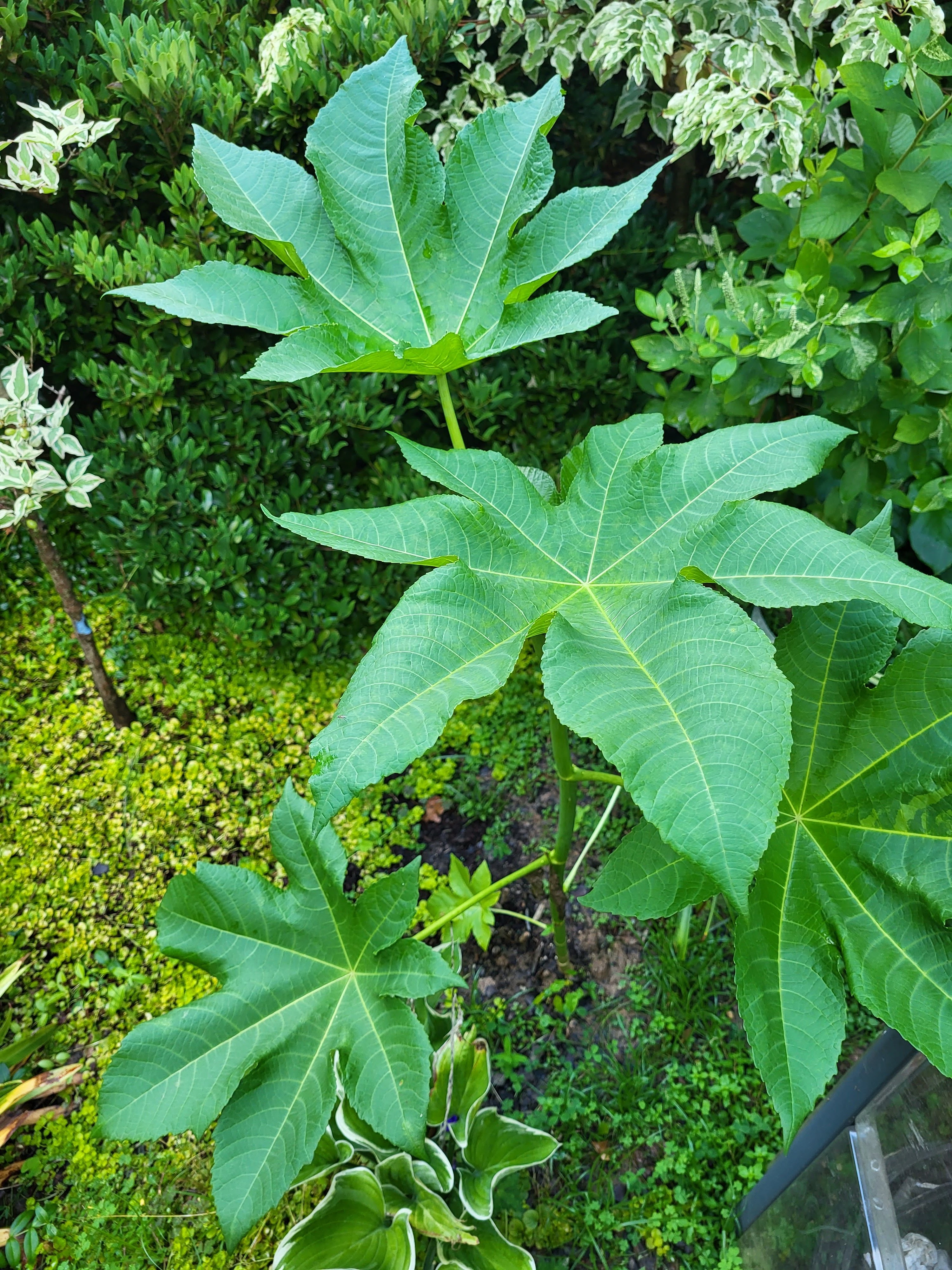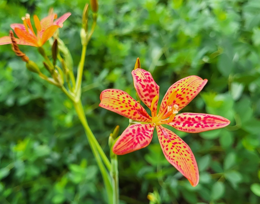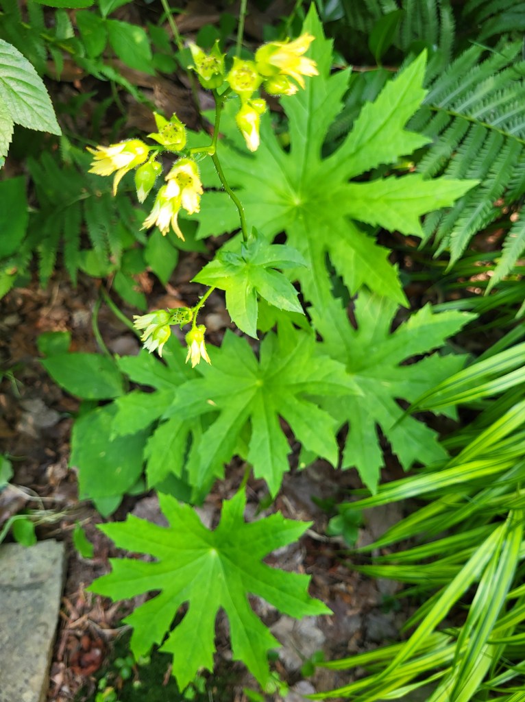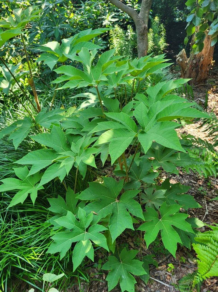 Two Wax bells species (Kirengeshoma palmata and K. koreana) are spotted through the shaded garden. A void where a severely leaning redbud was removed has been planted with a Japanese Rice Paper plant (Tetrapanax papyrifer ‘Steroidal Giant’ that should soon fill the space. It grew slowly in our cool, dry spring, but growth has picked up with recent rain and heat.Several Peltoboykinia (Peltoboykinia watanabei) with deeply incised leaves are planted along a stone path, with a seedling now appearing in a mossy gap in the stones.A year ago, a seedling of Castor Bean barely reached knee high in damp ground. In dry soil beside the greenhouse it is far taller with most of its growth still to come.Blackberry lilies (Iris domestica, once Belamcanda chinensis) are flowering. From a few plants, seeds have been harvested, and seedlings grown for two years. These flower in their second year. More are ready to plant, with a few set for giveaways. Two Japanese beetles are the few found in the garden. Birds must keep the numbers under control.