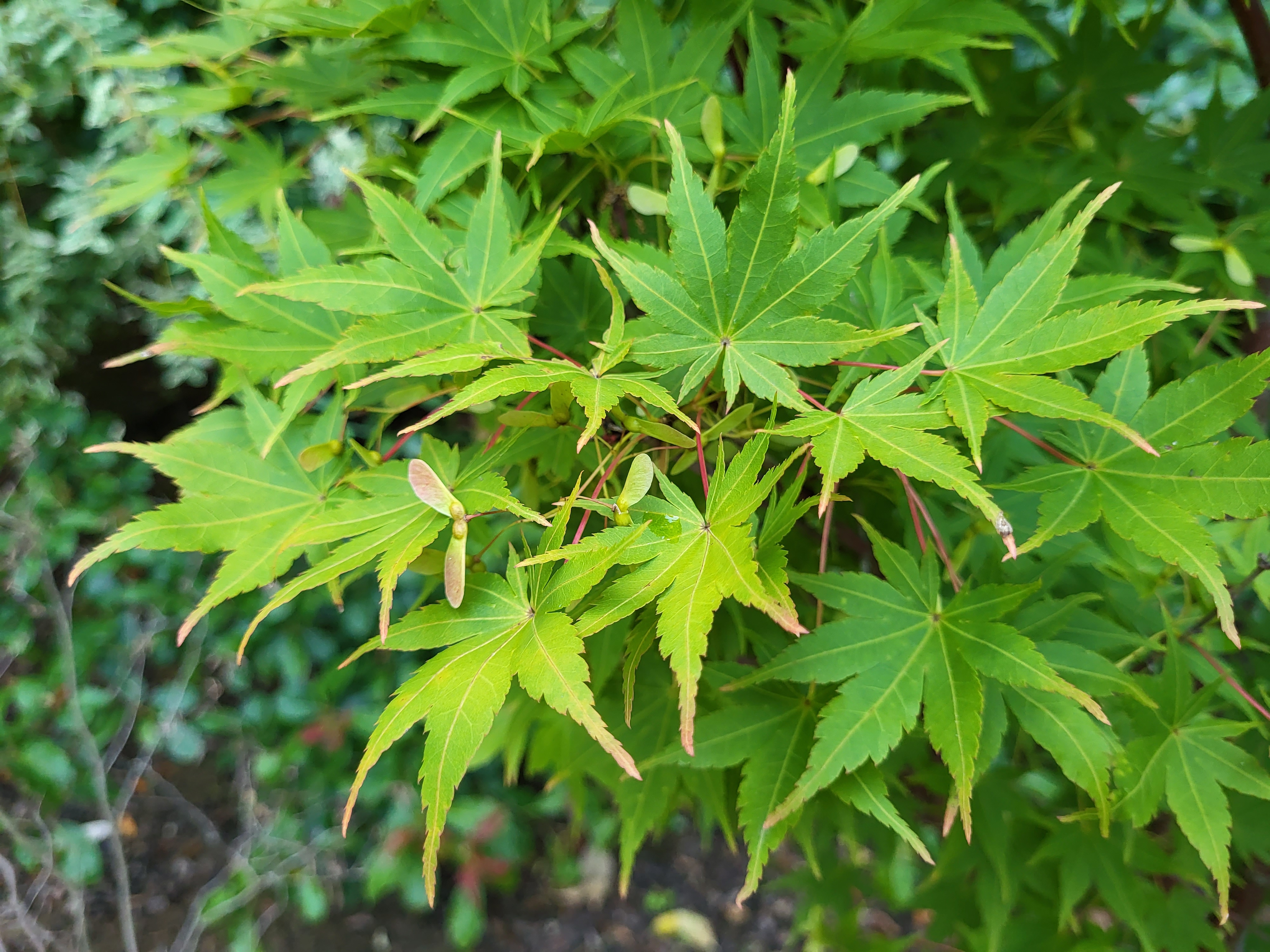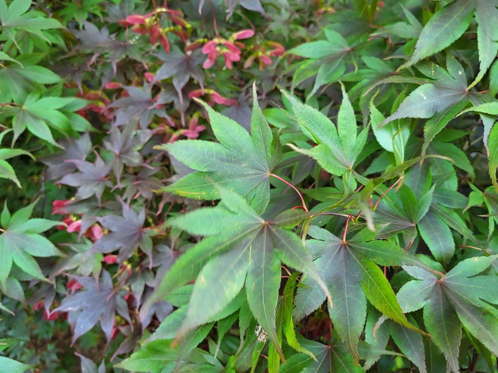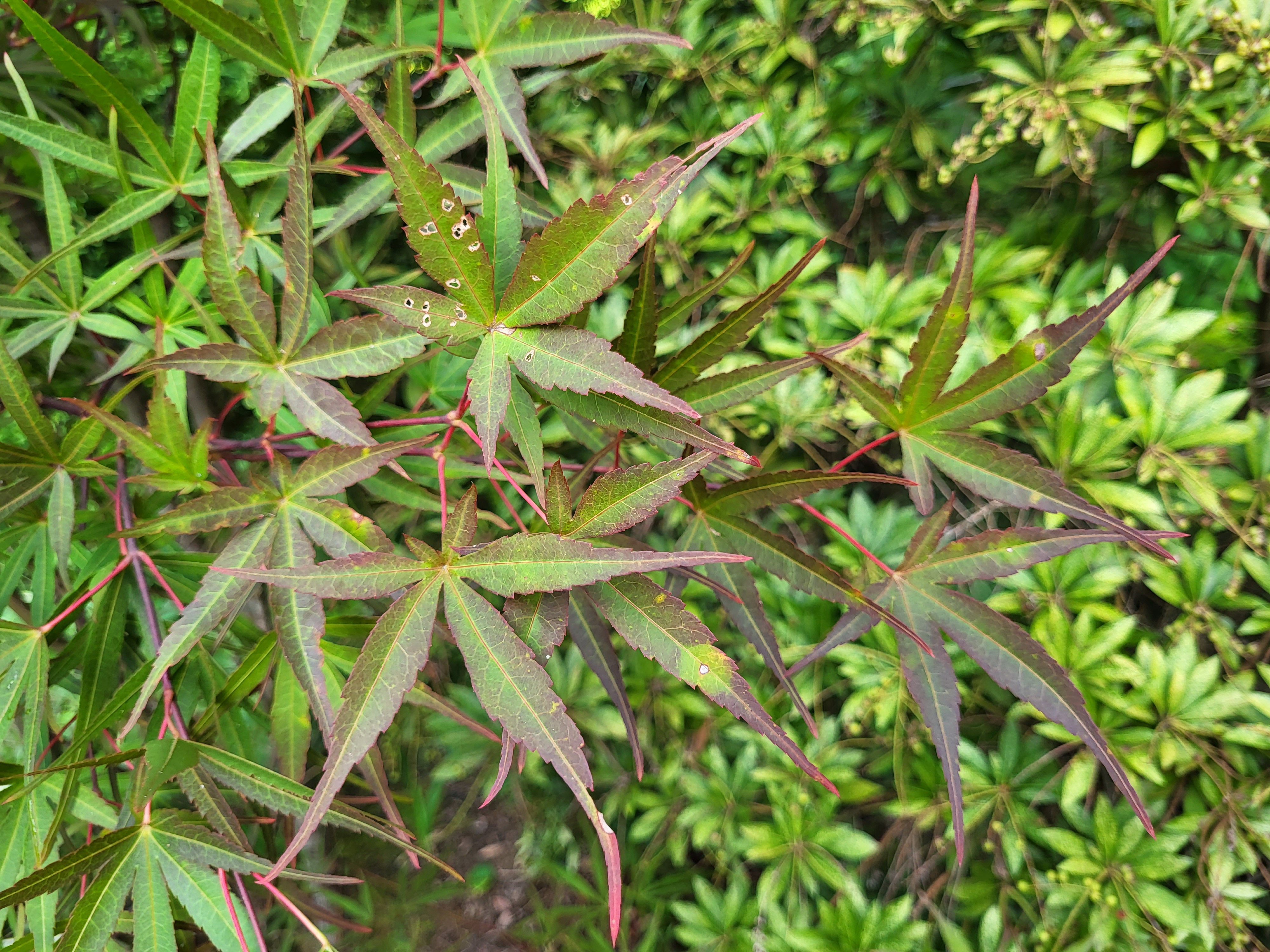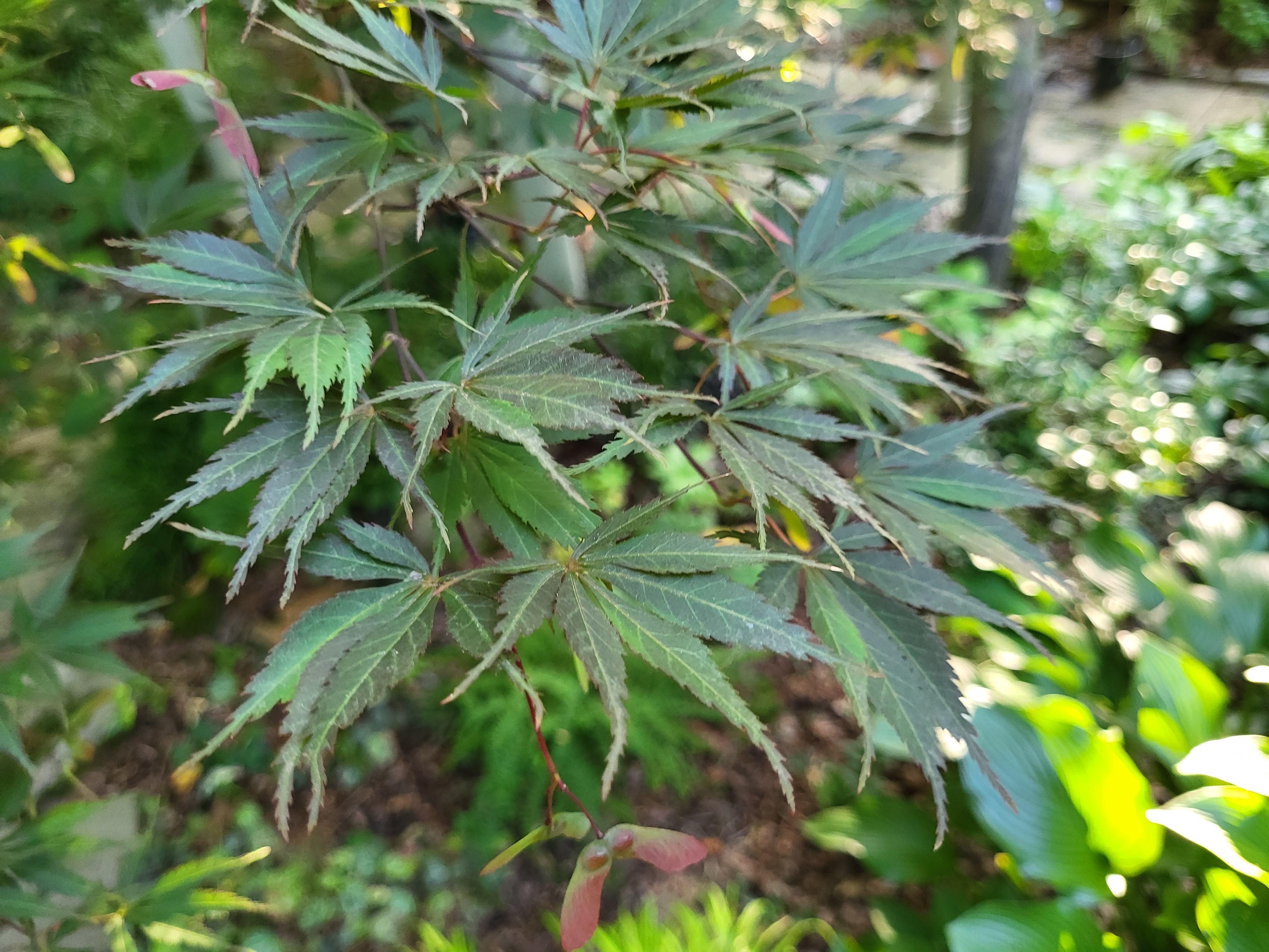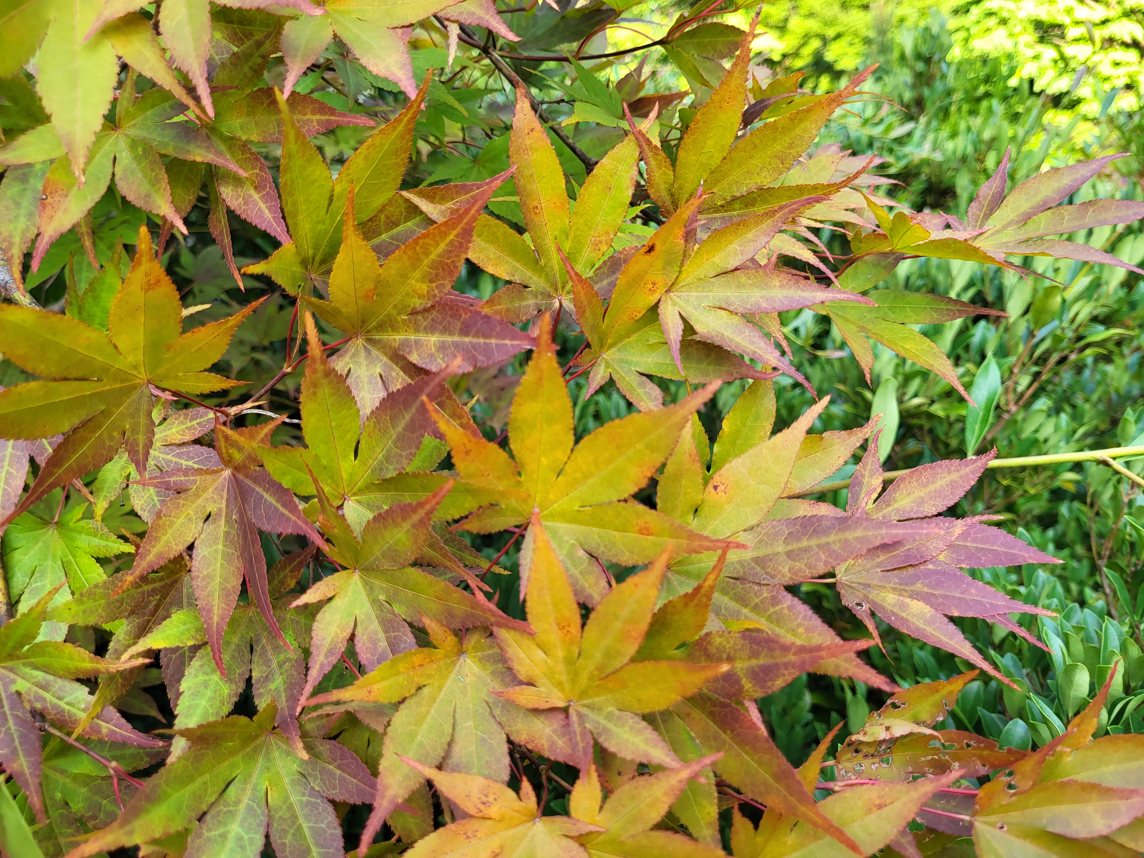 Two large, green leafed ‘Seriyu’ maples arch over the front walk.One side of ‘Hubb’s Red Willow” is partially shaded, with leaves on the sunnier side fading more. ‘Hubb’s’ was planted near death, so it has taken a few years for it to fully recover. Foliage color of ‘Bloodgood’ varies by the branch, with some remaining red while branches with early morning sun exposure fade to yellow. The variation is interesting.The partially shaded Golden Full Moon maple (Acer shirasawanum ‘Aureum’) loses some of its spring brightness, but the color remains yellow. At an earlier age, leaves in more sun became crispy along the edges. With space becoming limited ‘Twombly’s Red Sentinel’ was the perfect tree to be shoehorned into this tight space. I’ve been surprised by its rapid growth in a few years from a thin six foot maple to double the height. In mostly full sun, a few leaves on ‘Twombly’s’ have become crispy, but most of the tree is in perfect health and faded only slightly from spring. The variegation of ‘Butterfly’ loses its pink by late spring, but the green and white variegation remains.In part shade, the color of ‘Burgundy Lace’ is not as dark as other maples when it comes into leaf. While some leaves are sun damaged, most foliage of the yellow stemmed ‘Bihou’ remains fresh in the summer heat.Green leafed maples such as this Linearlobum type maple rarely show any summer damage.A coral bark maple (Sango-kaku) failed in damp soil, so another was planted nearby in drier ground and shade from the late afternoon sun. It is growing splendidly.The large, fernleaf Japanese maple (Acer japonicum ‘Aconitifolium’) is slowly declining with a limited area for its wide spreading roots, but it continues to be a favorite with glorious autumn foliage color.In mostly full sun, this red leafed, weeping maple fades , but is still splendid. Two Lion’s Head Japanese maples (‘Shishigashira’) have grown to fifteen feet or taller. Leaves are not changed by the summer heat.