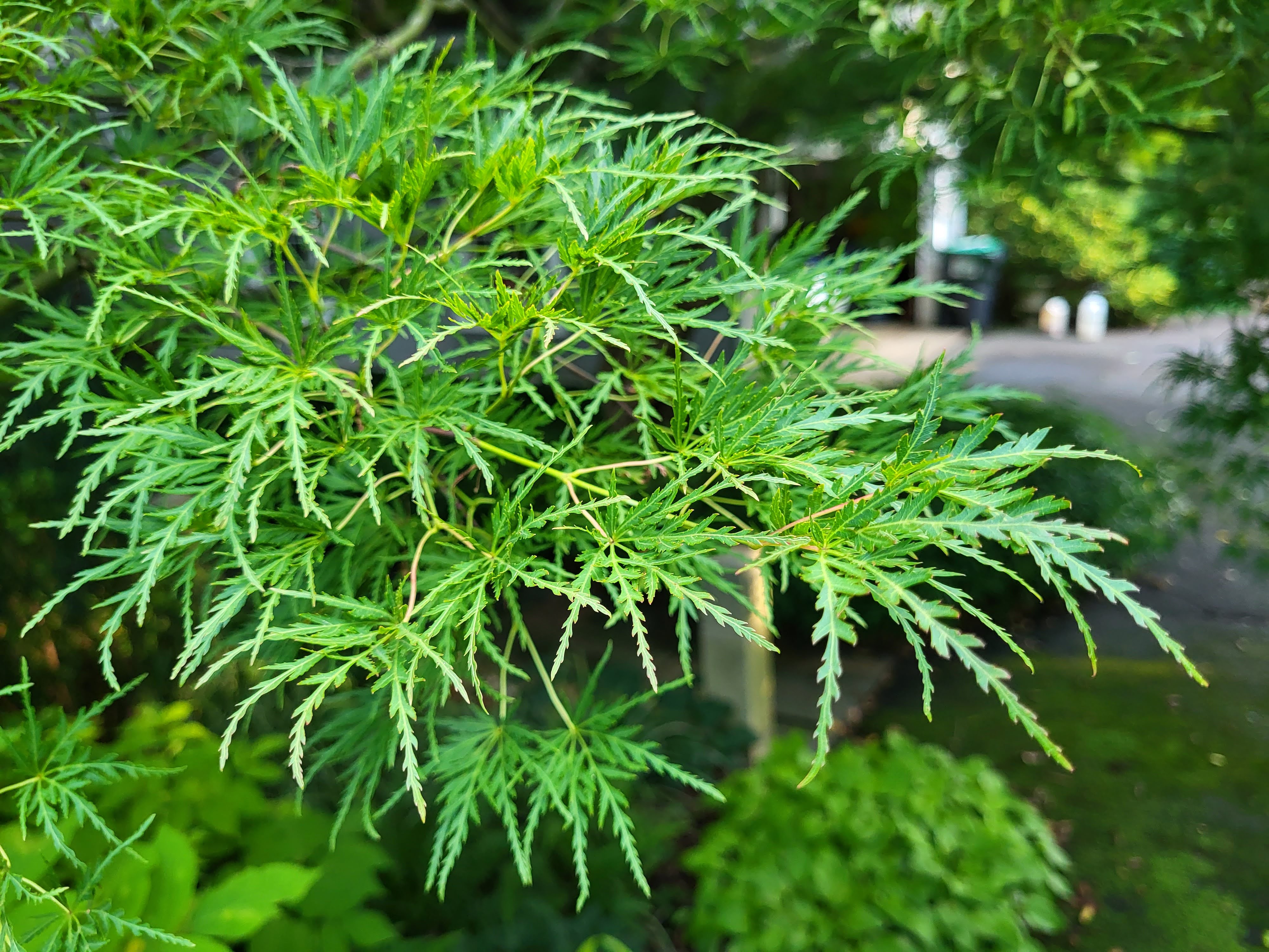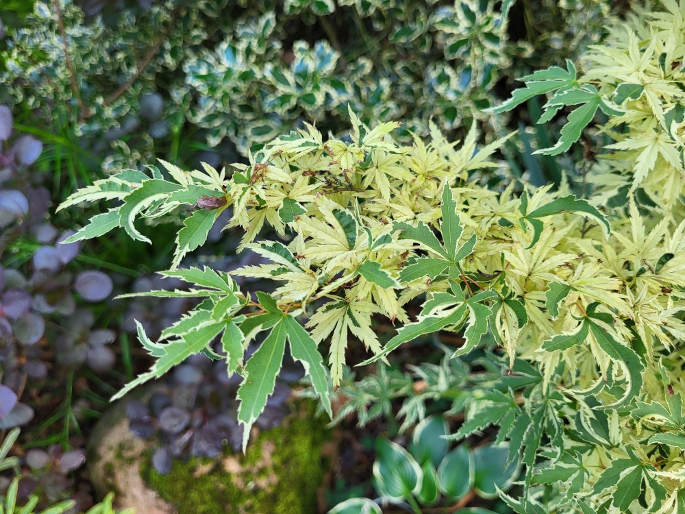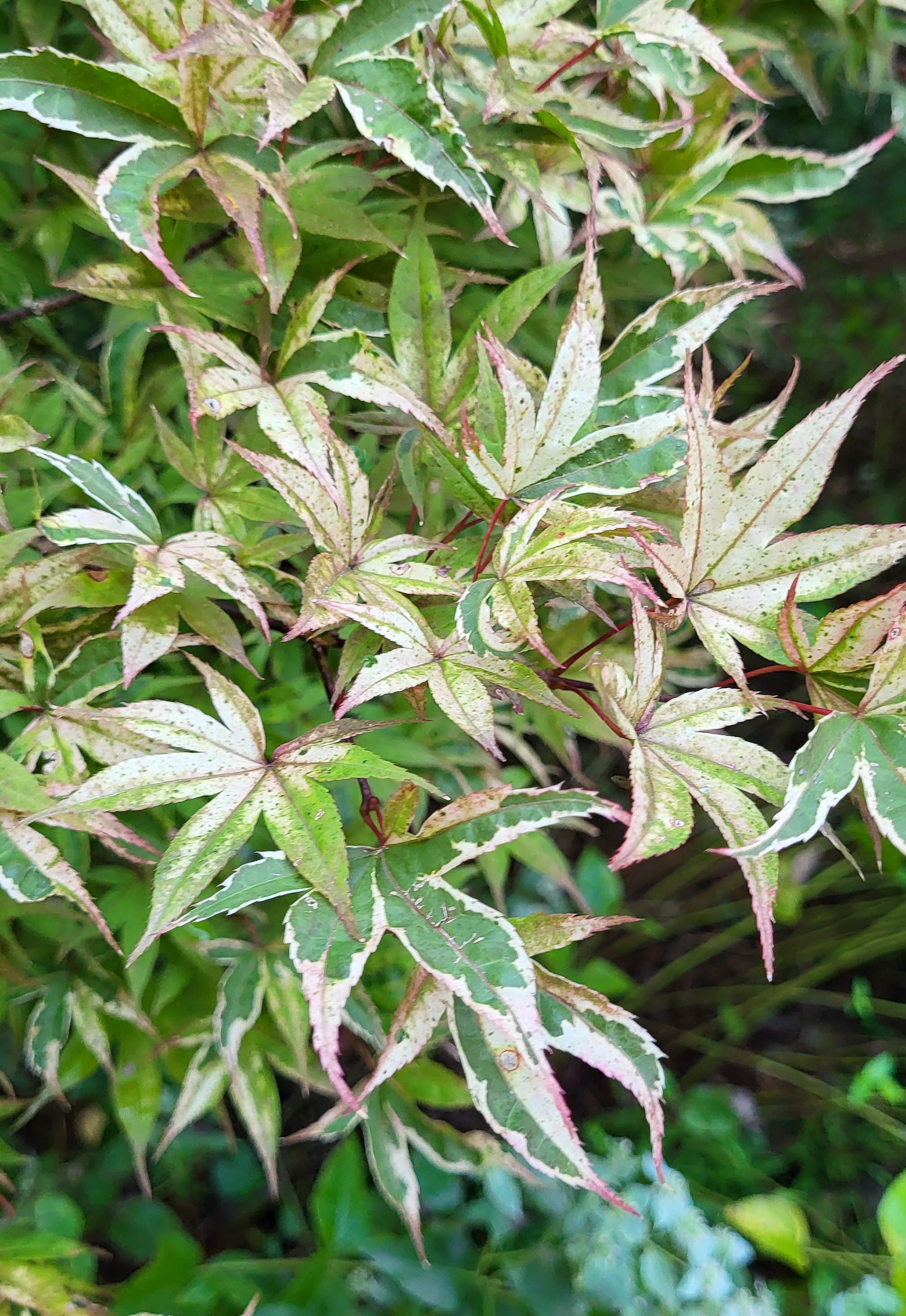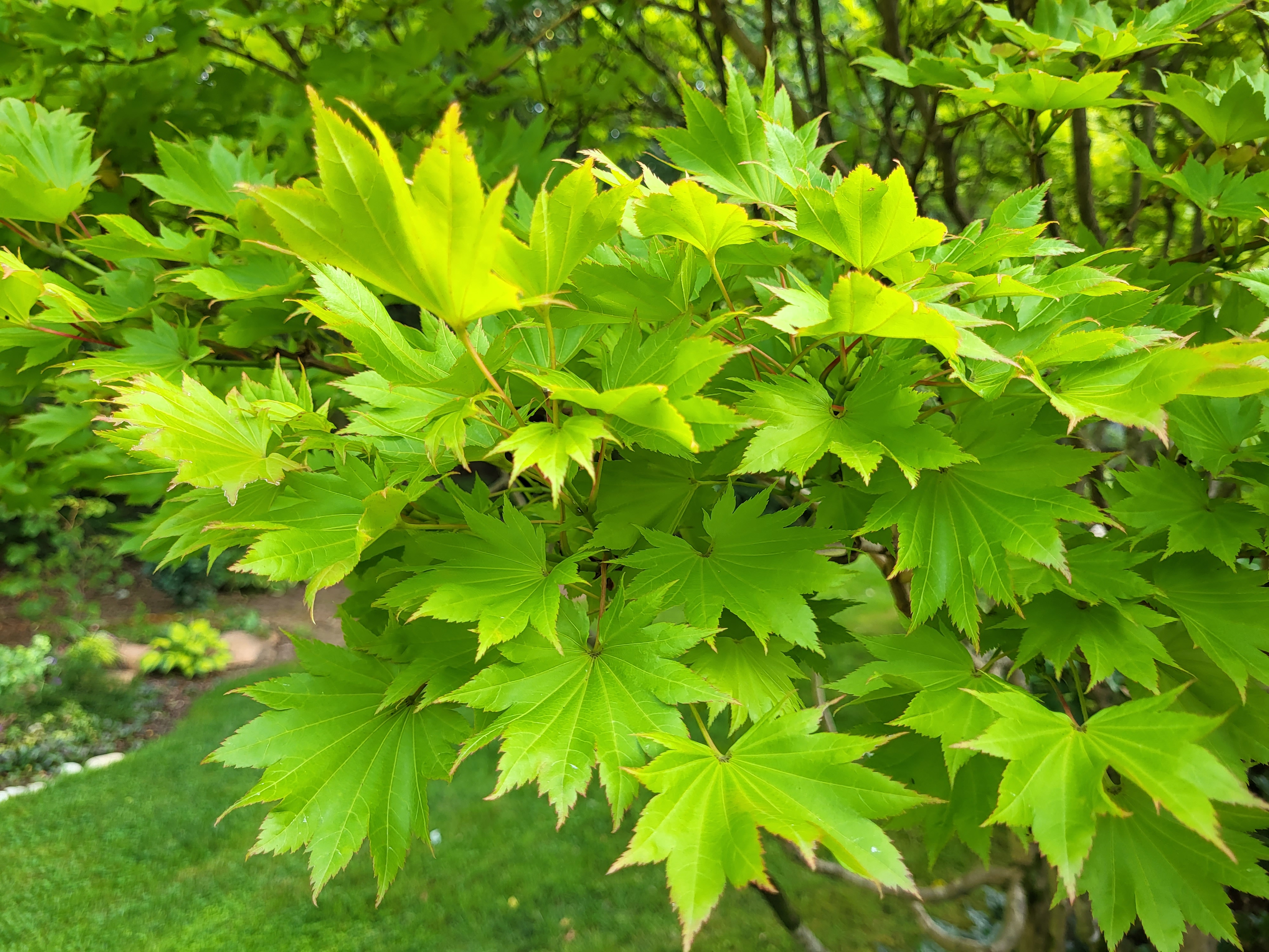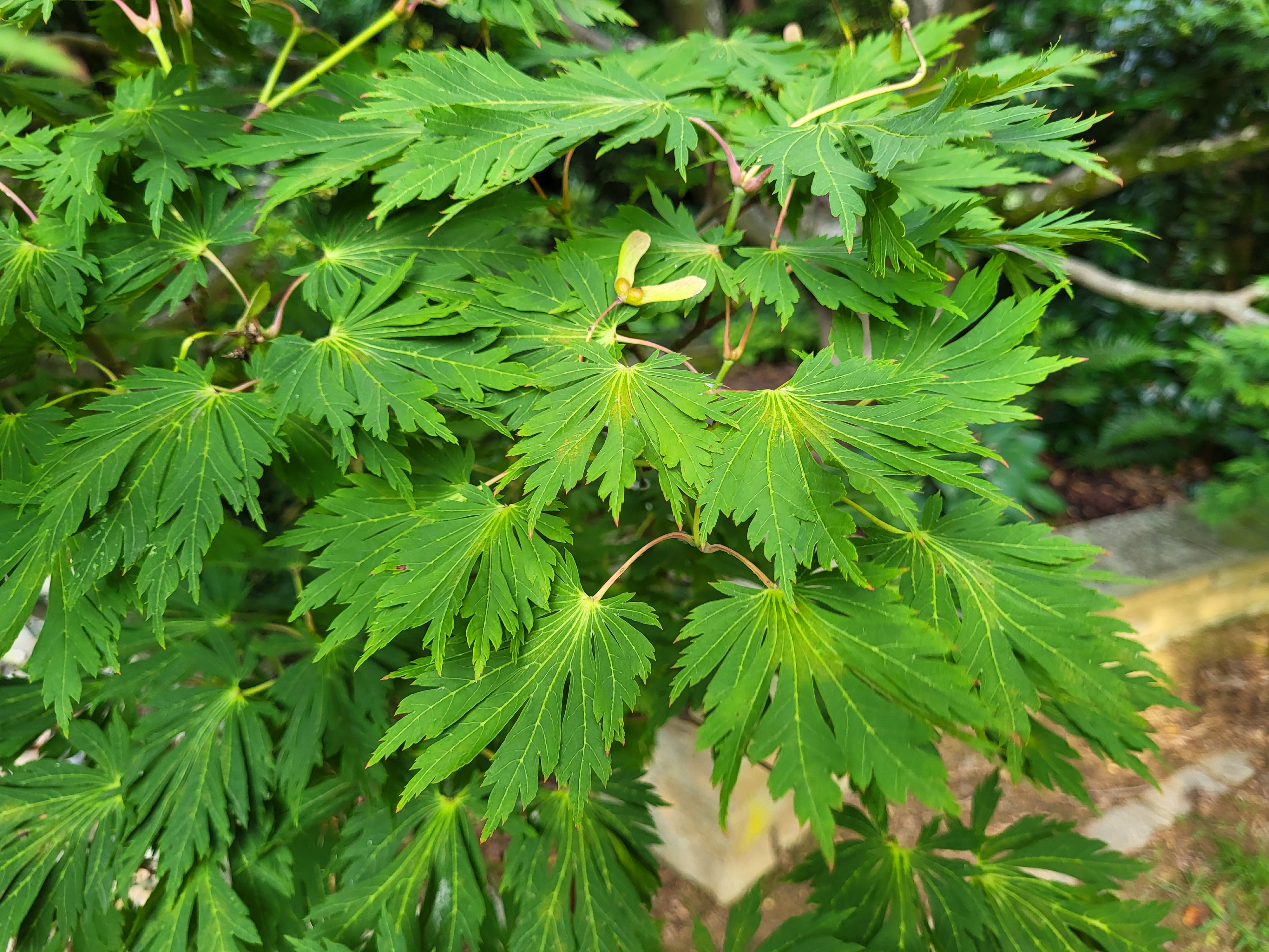 Two large, green leafed ‘Seriyu’ maples arch over the front walk.One side of ‘Hubb’s Red Willow” is partially shaded, with leaves on the sunnier side fading more. ‘Hubb’s’ was planted near death, so it has taken a few years for it to fully recover. Foliage color of ‘Bloodgood’ varies by the branch, with some remaining red while branches with early morning sun exposure fade to yellow. The variation is interesting.The partially shaded Golden Full Moon maple (Acer shirasawanum ‘Aureum’) loses some of its spring brightness, but the color remains yellow. At an earlier age, leaves in more sun became crispy along the edges. With space becoming limited ‘Twombly’s Red Sentinel’ was the perfect tree to be shoehorned into this tight space. I’ve been surprised by its rapid growth in a few years from a thin six foot maple to double the height. In mostly full sun, a few leaves on ‘Twombly’s’ have become crispy, but most of the tree is in perfect health and faded only slightly from spring. The variegation of ‘Butterfly’ loses its pink by late spring, but the green and white variegation remains.In part shade, the color of ‘Burgundy Lace’ is not as dark as other maples when it comes into leaf. While some leaves are sun damaged, most foliage of the yellow stemmed ‘Bihou’ remains fresh in the summer heat.Green leafed maples such as this Linearlobum type maple rarely show any summer damage.A coral bark maple (Sango-kaku) failed in damp soil, so another was planted nearby in drier ground and shade from the late afternoon sun. It is growing splendidly.The large, fernleaf Japanese maple (Acer japonicum ‘Aconitifolium’) is slowly declining with a limited area for its wide spreading roots, but it continues to be a favorite with glorious autumn foliage color.In mostly full sun, this red leafed, weeping maple fades , but is still splendid. Two Lion’s Head Japanese maples (‘Shishigashira’) have grown to fifteen feet or taller. Leaves are not changed by the summer heat.