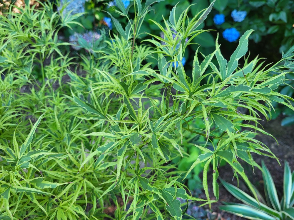 Green leafed Japanese maples vary little from spring to summer and many not shown here have grown quite large. There is no question, spring or summer, red leafed, green or variegated, Japanese maples are the favorites in this garden. (Note – all photos were taken in mid July, 2023)