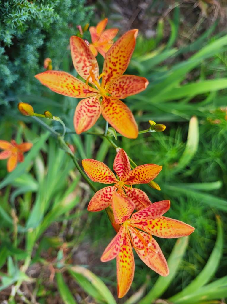 Attention to watering is the key, and I just don’t get the attention thing. I’ve killed far too many seedlings and cuttings, but I’m proud to announce that several dozen Blackberry lilies (Iris domestica, aka Belamcanda chinensis, above) planted from seed in late winter are now eight to ten inches tall in four inch pots. Fortunately, ones I’ve planted in prior years supply hundreds of seeds, and these dozens have survived my neglect.