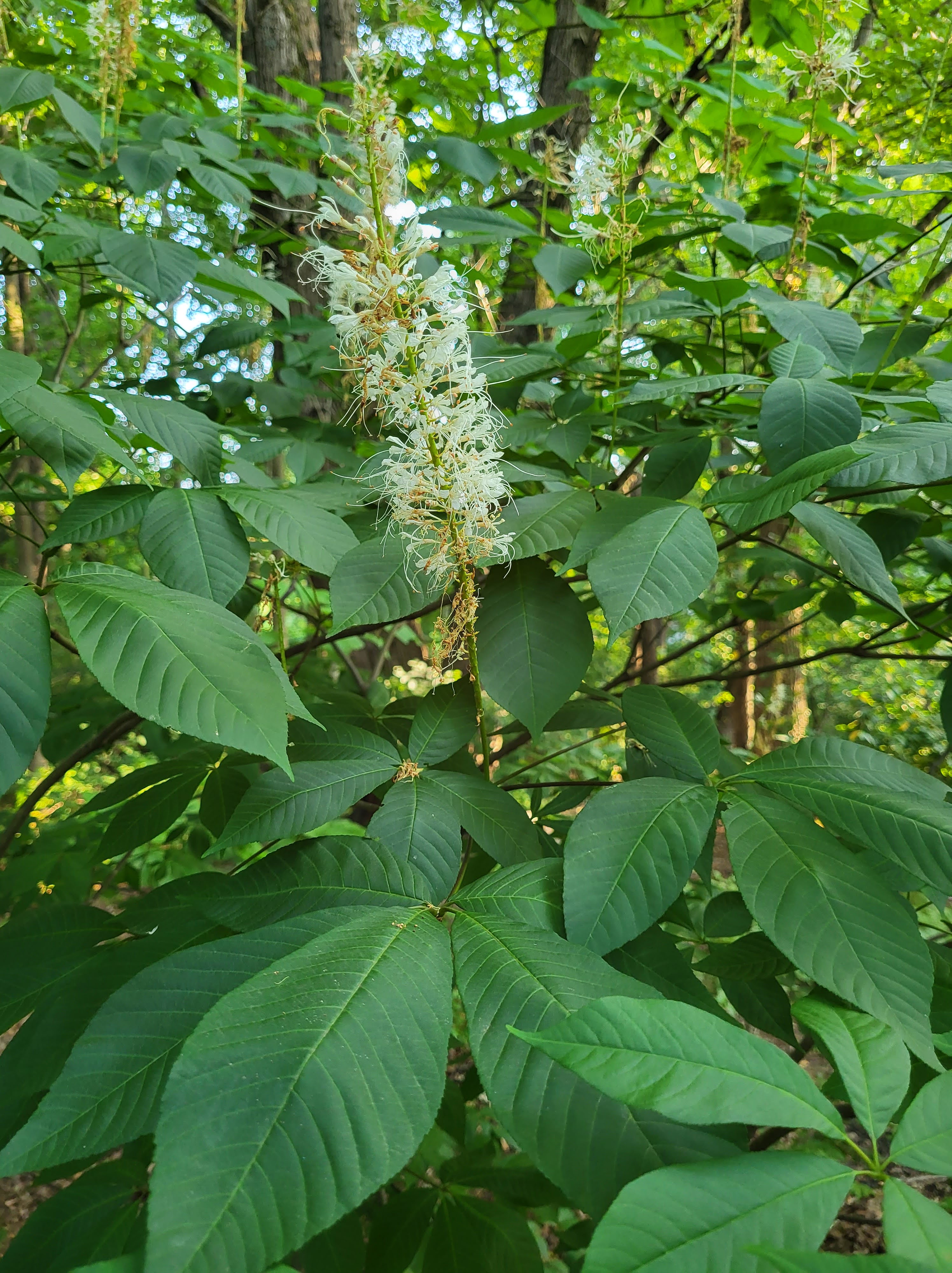 My two weeks of summer business travel annually coincide with the peak flowering of three Bottlebrush buckeyes (Aesculus parviflora, below). Two in part sun in the rear garden flower first, but both were barely cracking bud when I left the second week of July. The third, the oldest and by far the largest, is more shaded so flowers remained when I returned, but they were far past their peak.