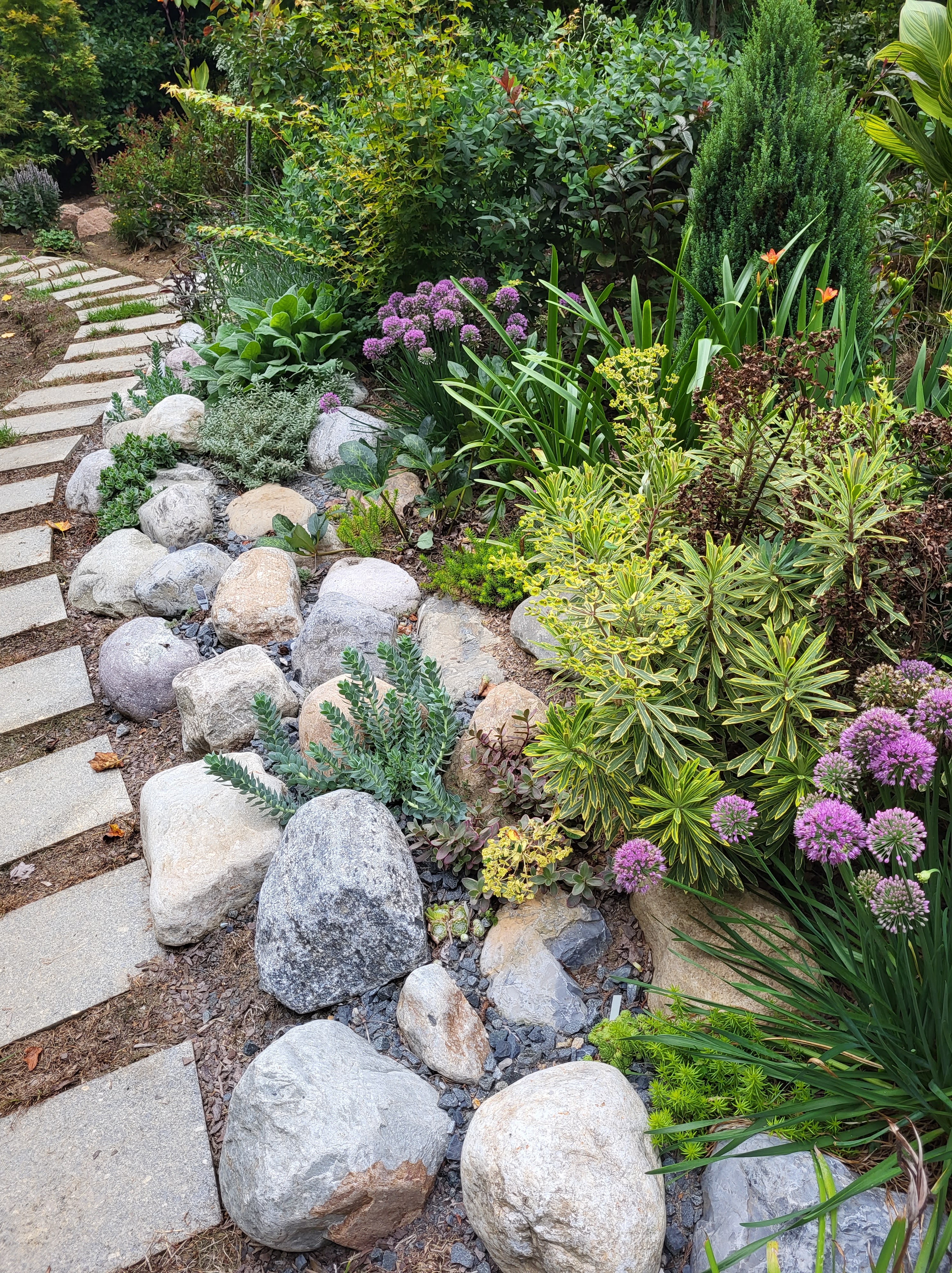 Summer’s dryness in this garden has gone on far too long, so I must celebrate the storm that passed through last night. I don’t know the rain total, but one thunderstorm after another hit us, enough to top off the level of a few of the garden’s ponds. Plants are looking good despite the prolonged dry spell, so I don’t expect to see much change. Certainly, they’ll be happier with more moisture.