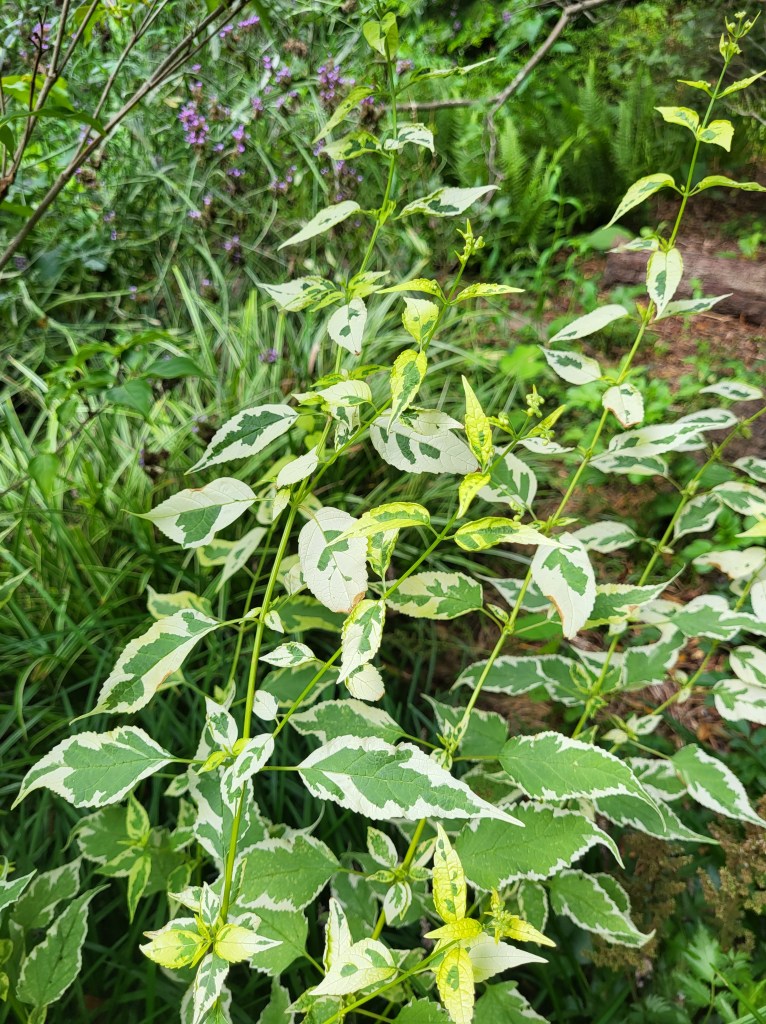 Here, I see two blue mist shrubs (Caryopteris), one with yellow foliage (above), the other variegated (below), that are obscured from view. Both should be relocated in late autumn before they are lost in this mass of foliage. But, besides this minor issue, I am quite pleased that the primary features in this planting continue to stand out while Verbena bonariensis, blackberry lilies, and a variety of toad lilies (Tricyrtis) and ground orchids expand to fill any open ground.