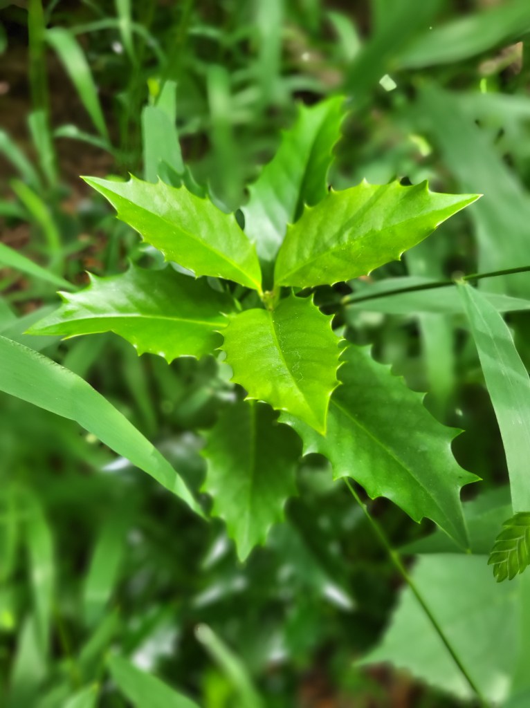 While pulling hefty weeds from beneath the gordlinia, I spotted a holly seedling of unknown provenance (below). While this seedling is nearest a Nellie R. Stevens, there are multiple hollies closeby, and the seedling could be related to any. In the short term, it will stay, but clearly, a holly growing to twenty feet tall is inappropriate growing beneath the shrubby gordlinia. I am curious to see what becomes of this chance seedling, so the holly is likely to be kept and then transplanted rather than discarded. Some day.