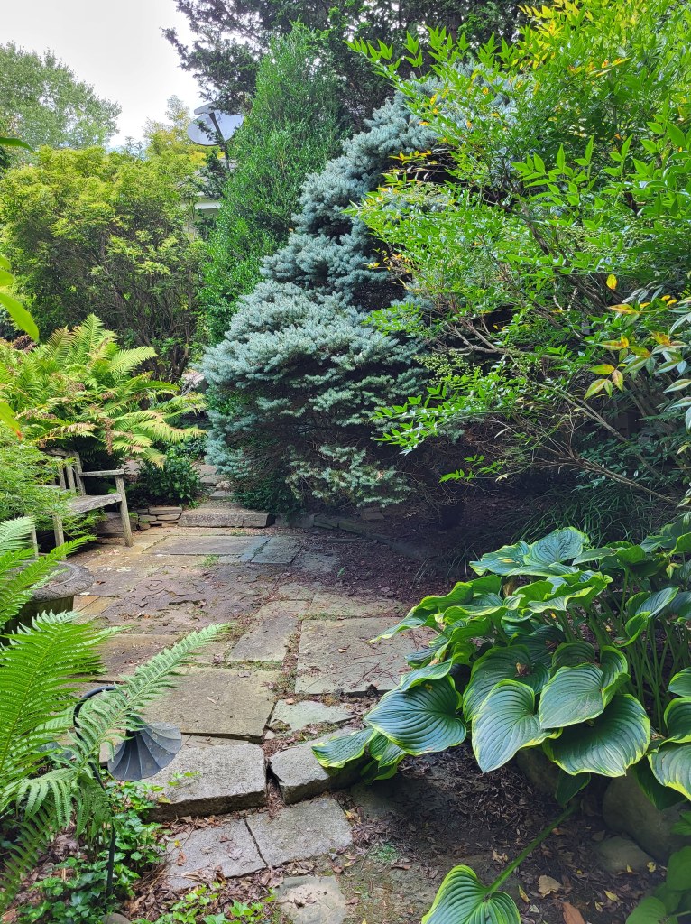 I am not one to readily give up on a plant. The back side of a decades old blue, globose spruce (Picea pungens ‘Glauca Globosa’) has gone bare alongside a conical common boxwood (Buxus sempervirens). The boxwood has long encroached on the narrow path, and the spruce spreads several feet over the small, circular patio (below).