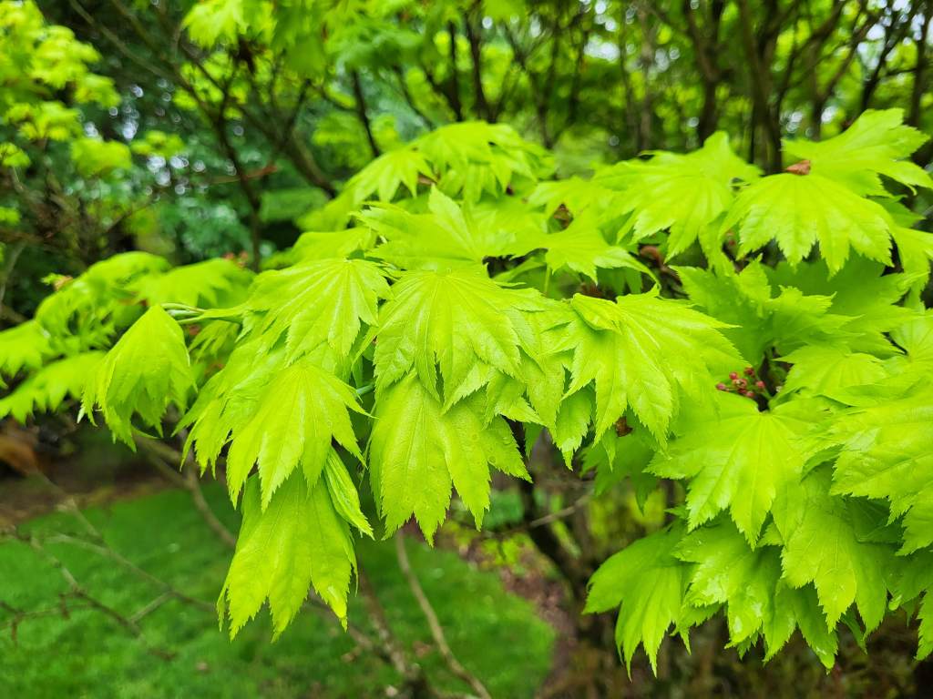 My internal debate, deciding to tear down this oldest part of the garden, or not, was aided by the imminent delivery of a ‘Moonrise’ Japanese maple (Acer shirasawanum ‘Moonrise’). I’ve gone back and forth for a while, trying to figure where this more sun tolerant Full Moon maple could be planted. It’s not a big maple at maturity. A similar Golden Full Moon (below) in the rear garden has topped out just over ten feet, and lower branches can be pruned to walk under. This is the ideal spot for the tree, where its delightful foliage color can be regularly viewed.