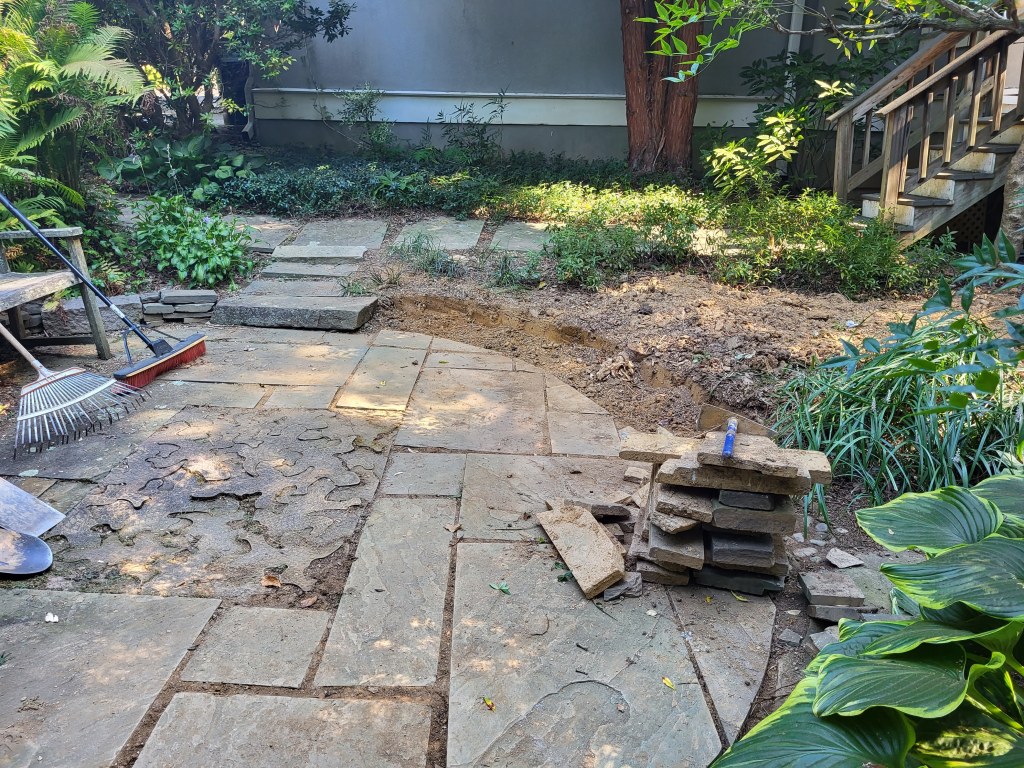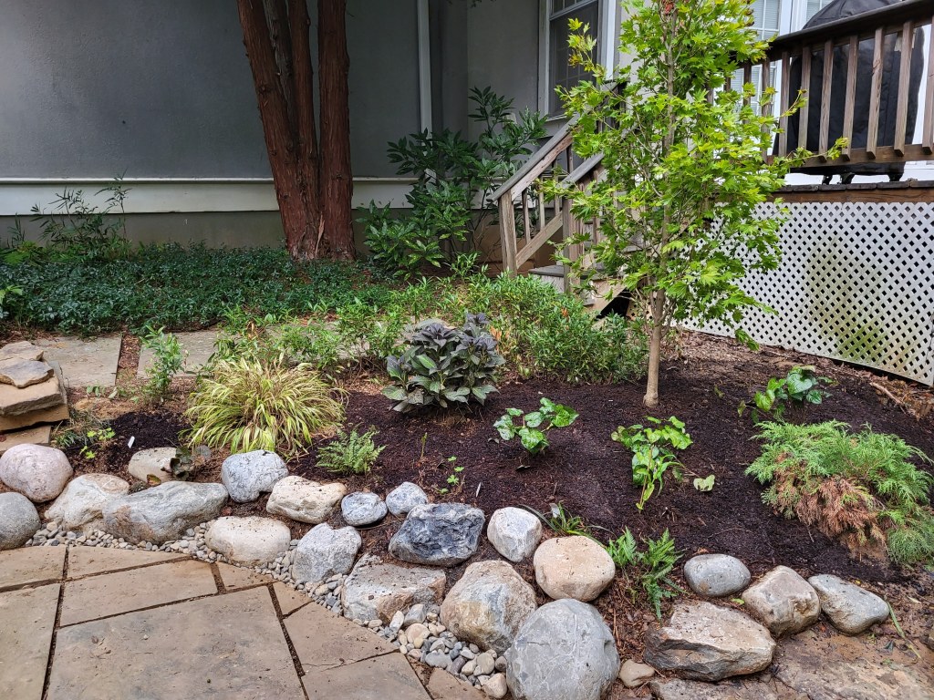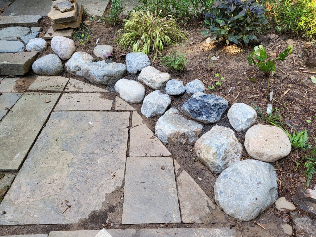 The void left after removing the spruce, boxwood, and nandina was disturbing, but I was comforted knowing it would soon be filled. With the spruce overhanging a significant portion of the bluestone patio, I had long ignored awkward gaps between flagstones that became glaringly obvious. These were repaired (on a ninety-six degree afternoon), and the next afternoon (ninety-eight degrees) the low stone wall retaining the modest slope was replaced by small boulders (below) that will allow planting in crevices that I enjoy.