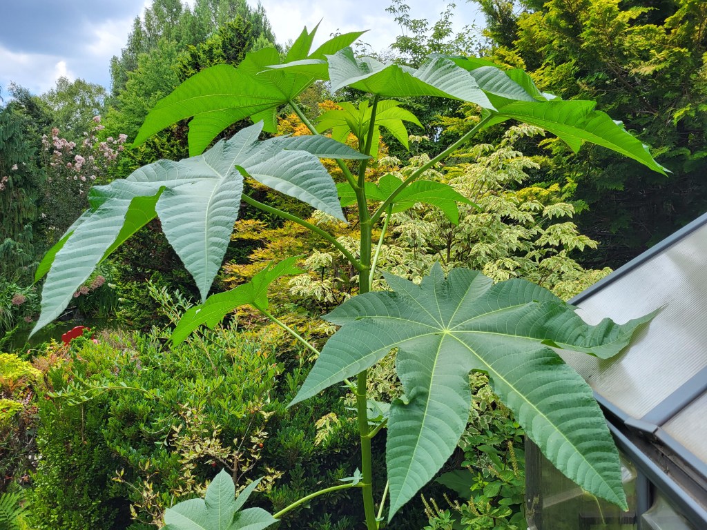 A few weeks ago, I marveled that the castor bean had topped the tip of the greenhouse, just over ten feet tall, I guessed. Today, the single trunk and huge leaves stand at least another four feet taller, rising far above the garden, though still dwarfed by a huge beech at the garden’s border. The beech, however, took two decades to reach this height while the castor bean’s growth is a matter of weeks.