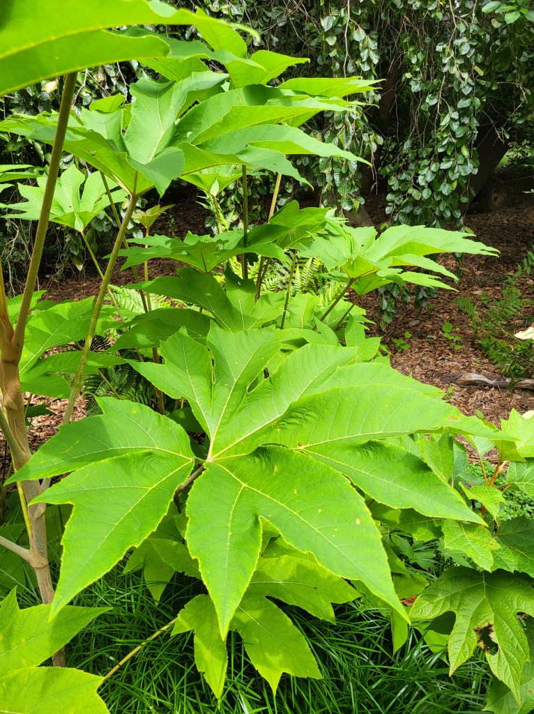 Of course, both the castor bean and Rice Paper plant will crumple to the ground with the first hard freezes. Perhaps the castor bean will flower and provide seeds so I can start my own for next summer, since it’s not cold hardy. The tetrapanax is cold hardy, so it will be begin showing growth by mid-spring, though it won’t amount to much before July. Then, it will take off.