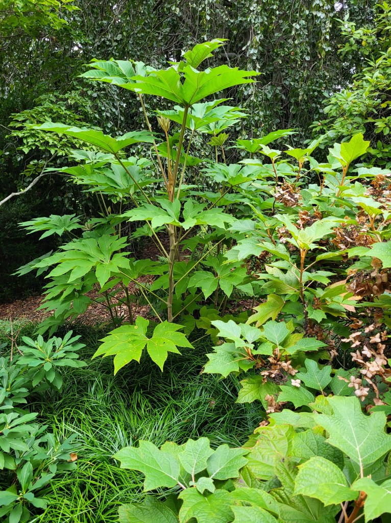 While the castor bean has grown as a single, tall trunk, the Rice Paper plant has spread to form a small colony. Fortunately, there’s room for it to spread a bit, but with additional plants I’ve dug one to share with our son. If it decides to spread too far, which it almost certainly will some day, it should be easily controlled by chopping back the spreading rhizomes a time or two each year.