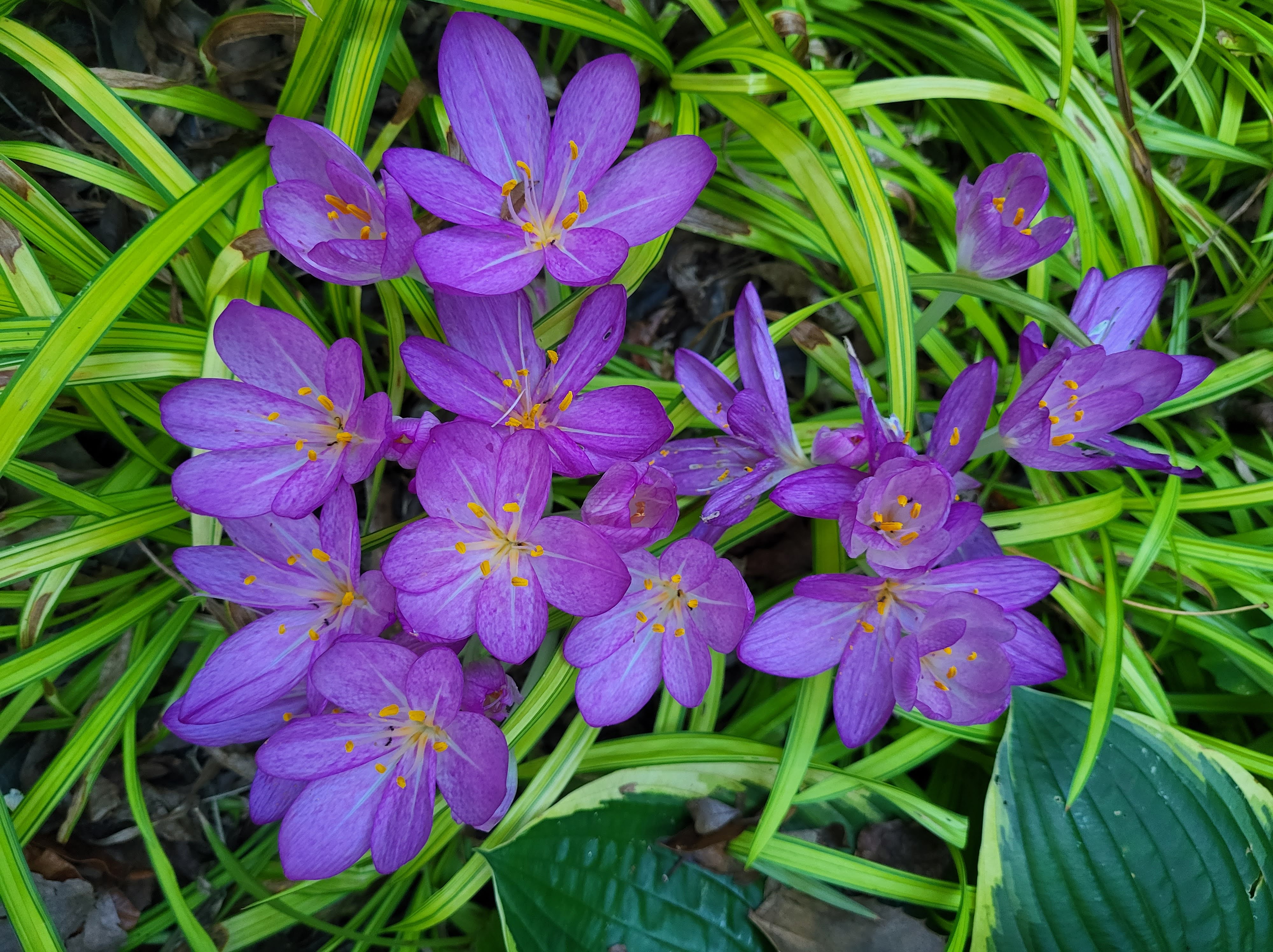 Near the surprise lilies by the driveway, the autumn flowering colchicum also borrows the appearance of foliage as it rises through the low growing, yellow leafed ‘Banana Boat’ carex (above). While many carex will tolerate full sun, others require no more than filtered sun. ‘Banana Boat’ tolerates a bit of sun, but it baked beside the driveway in the late summer heat. Only parts of the sedge nearest the asphalt were damaged, so I have no reason to consider moving it.