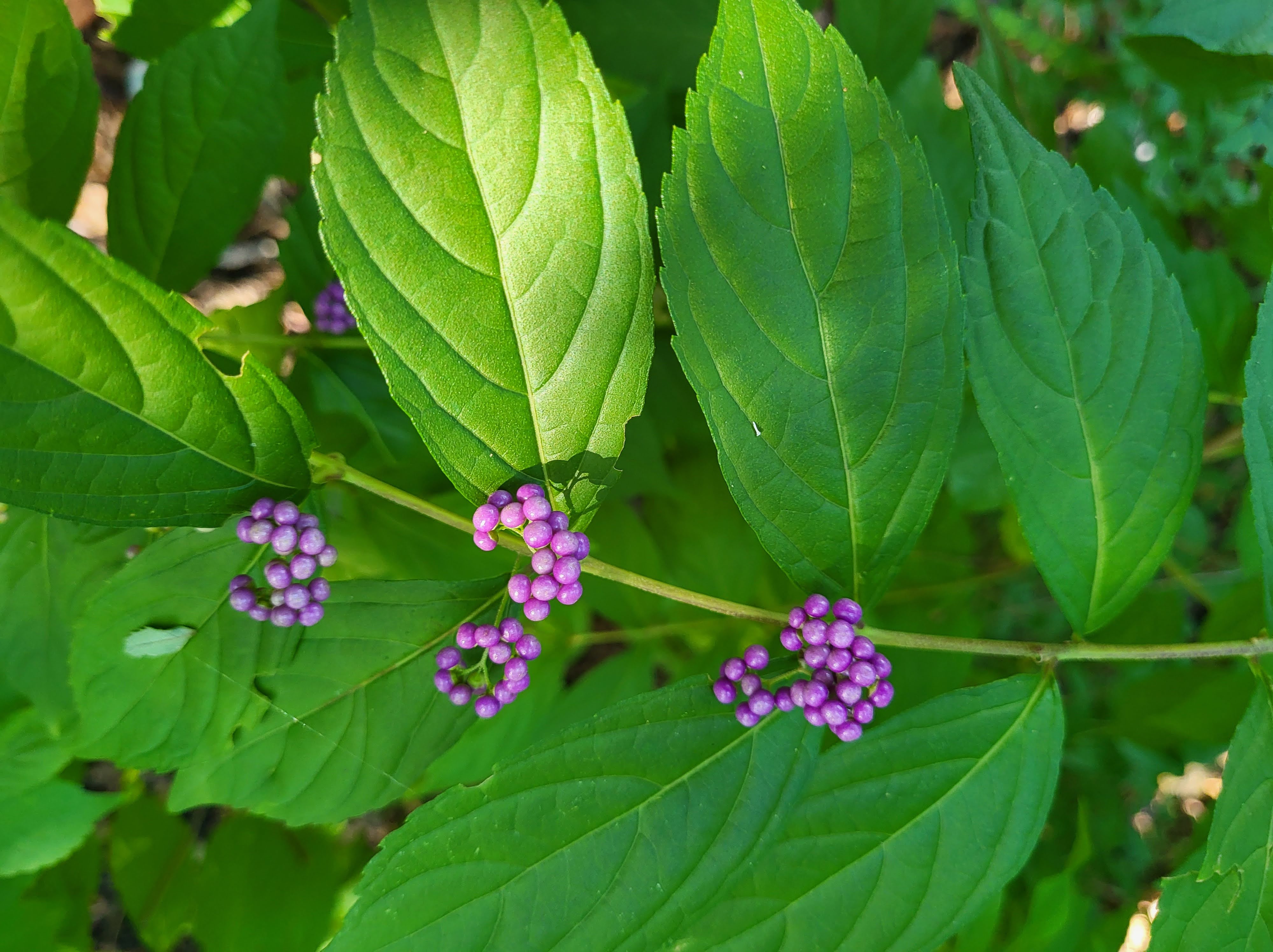 The beautyberries (Callicarpa, above and below) are nearing their peak color. Several varieties are scattered through the garden from shade to full sun, with ones that are shaded having only slightly fewer berries. Two American beautyberries (Callicarpa americana, below) did not survive last year, with only one remaining. They are slightly less woody than Asian varieties, and perhaps they’re more finicky about soil moisture.
