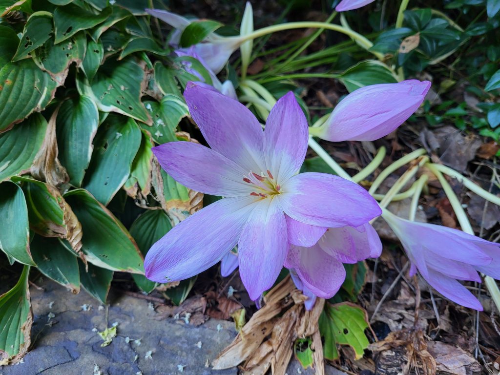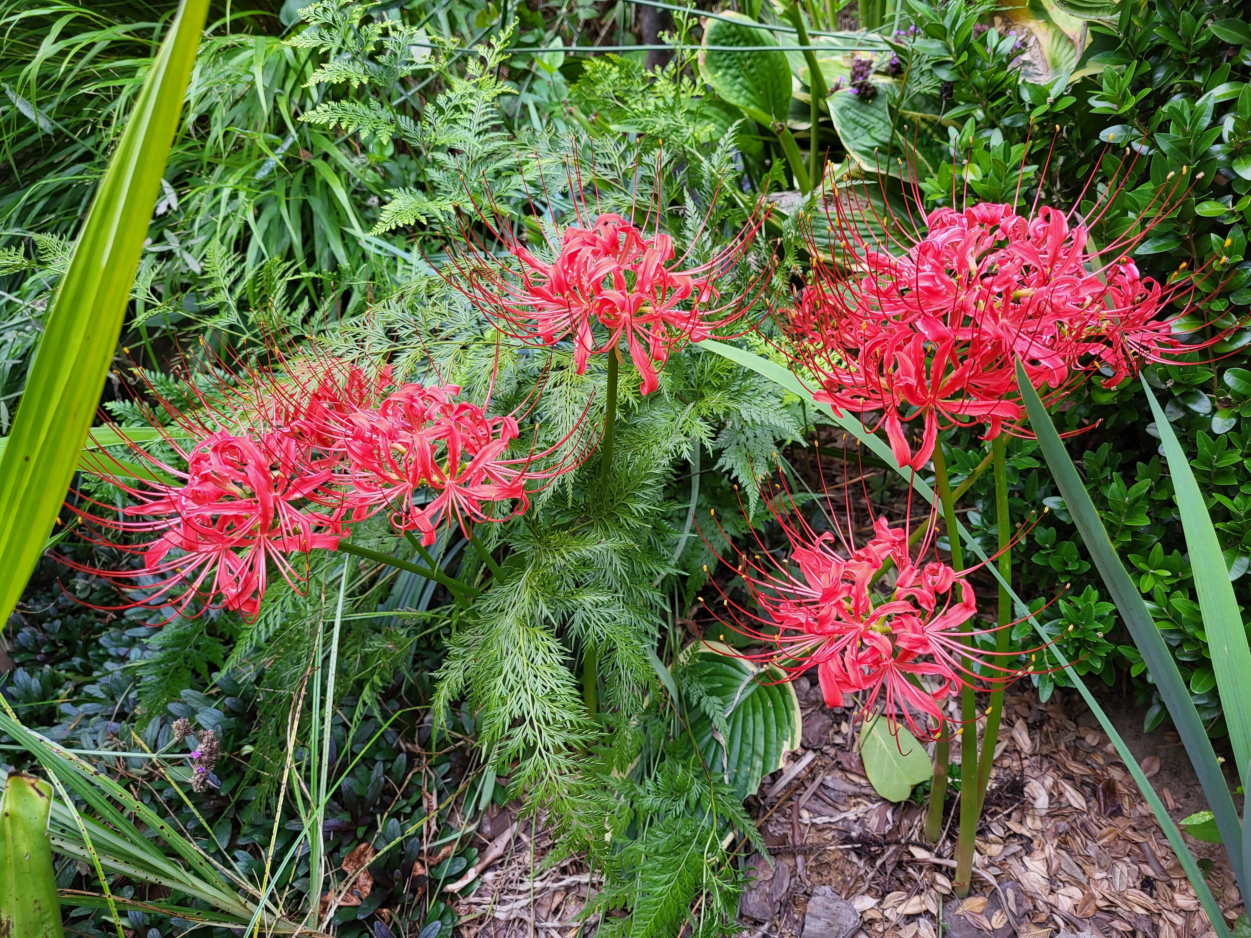 Several weeks ago, acquaintances began bragging over their surprise lilies (Lycoris radiata, above) while mine had yet to peek above ground. Of course, once they break ground flowering is only a few days off, and days later the old timers were up with newcomers a few days behind. The group in the front along the driveway were first, and I hardly noticed the ones beside the greenhouse. Barbara asked if the lacy foliage was from the lilies, but they have no leaves, only the flower.