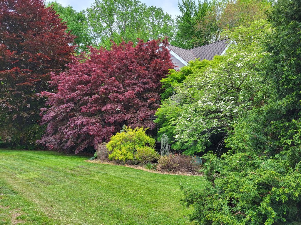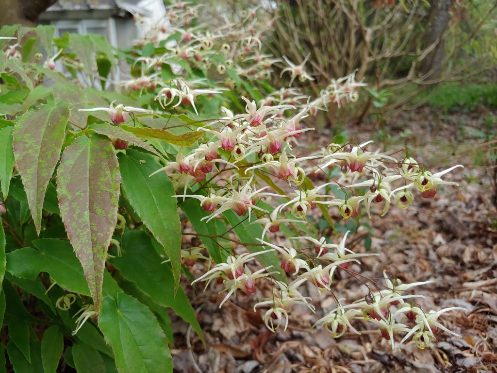 The front lawn and garden (above) is a fraction of the property, and while I have not removed areas of grass in recent years, the lawn diminishes annually as a purple leafed European beech, ‘Bloodgood’ Japanese maple, and a yellow flowered ‘Elizabeth’ magnolia continue their spread. As the grass thins, I will eventually plant more hostas and barrenworts (Epimedium, below) that thrive in the dry shade closer to the tree’s massive trunk.