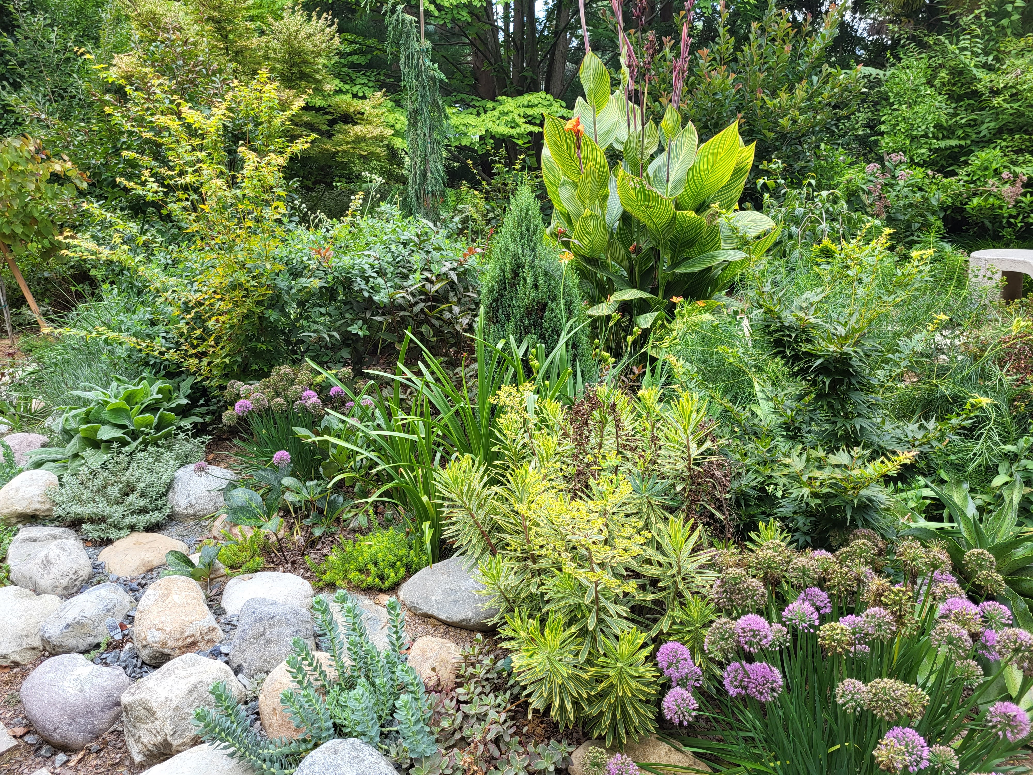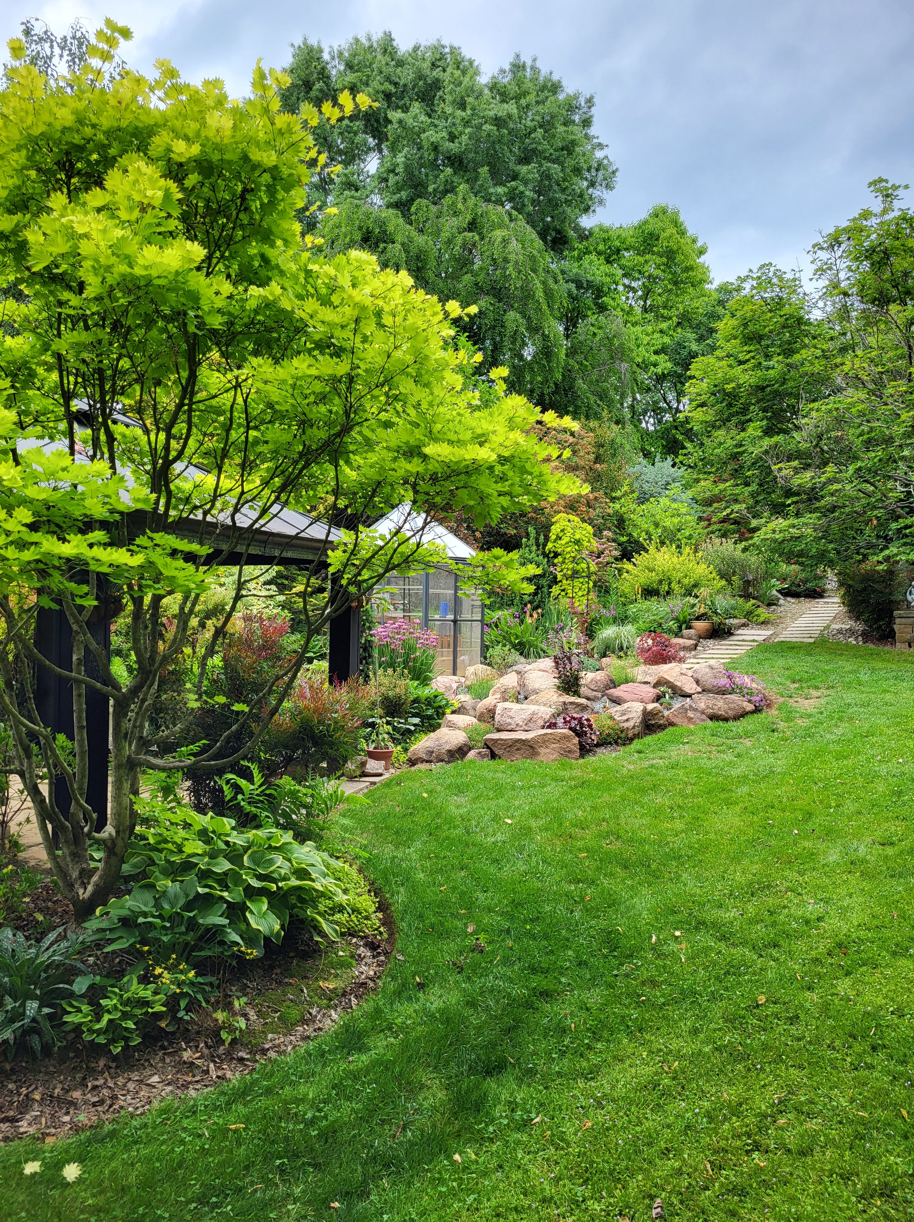 As my passion for plants multiplied, sections of grass were lopped off and turned to garden in large chunks, often with Barbara raising a ruckus. More than several times, she warned that no more lawn should be removed, but steadily, pieces were cut out and trees, ponds, paths, and patios were added. There was never a master plan, just one inspiration after the other until a year ago only two small sections of lawn remained on our acre and a quarter.