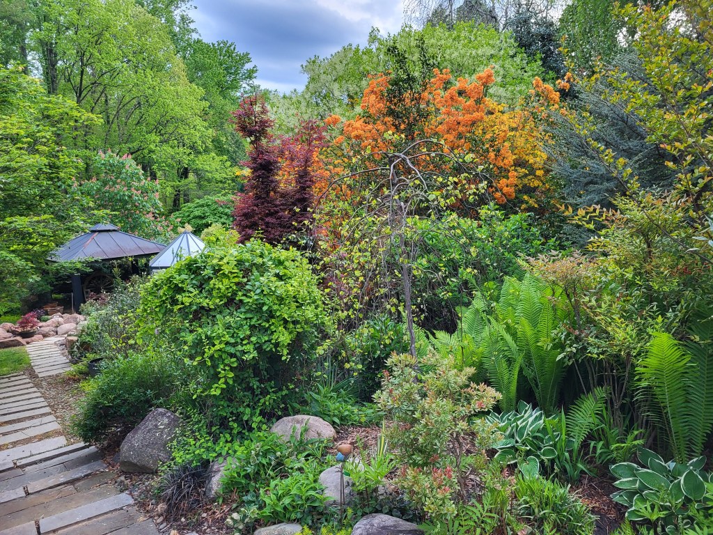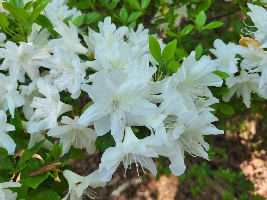 One grouping of Delaware Valley, white flowered azaleas (above) remained just off the property line under the canopy of the forest that borders the garden. These were never, and have never been infested significantly, and of course I have nothing against azaleas that perform beautifully without care. The large Delaware Valleys now mingle with sprawling purple flowered rhododendrons, and never mind that both reside outside our property, they require no attention but to admire their splendid blooms.