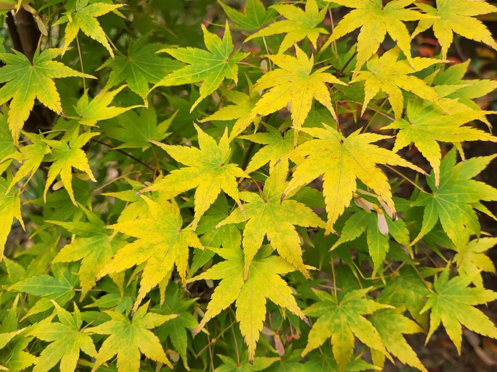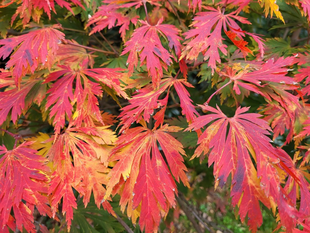 While the peak color is currently on display, several of the most colorful Japanese maples (above and below) do not turn until mid-November. A few of the maples turn to an unremarkable yellow, but others glow with buttery yellows and brilliant reds. The best of the lot, I think, the fernleaf Japanese maple (Acer japonicum ‘Aconitifolium’, above) seems slower to turn this year, and unfortunately, the mottled reds and yellows must compete with scattered, drought-induced, brown leaves.