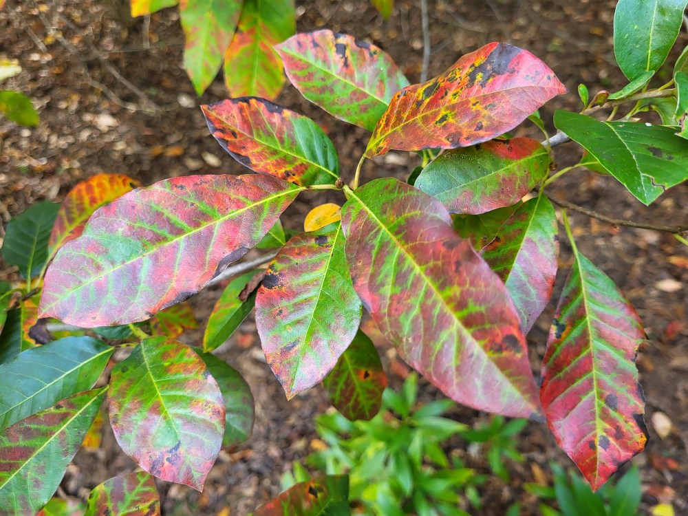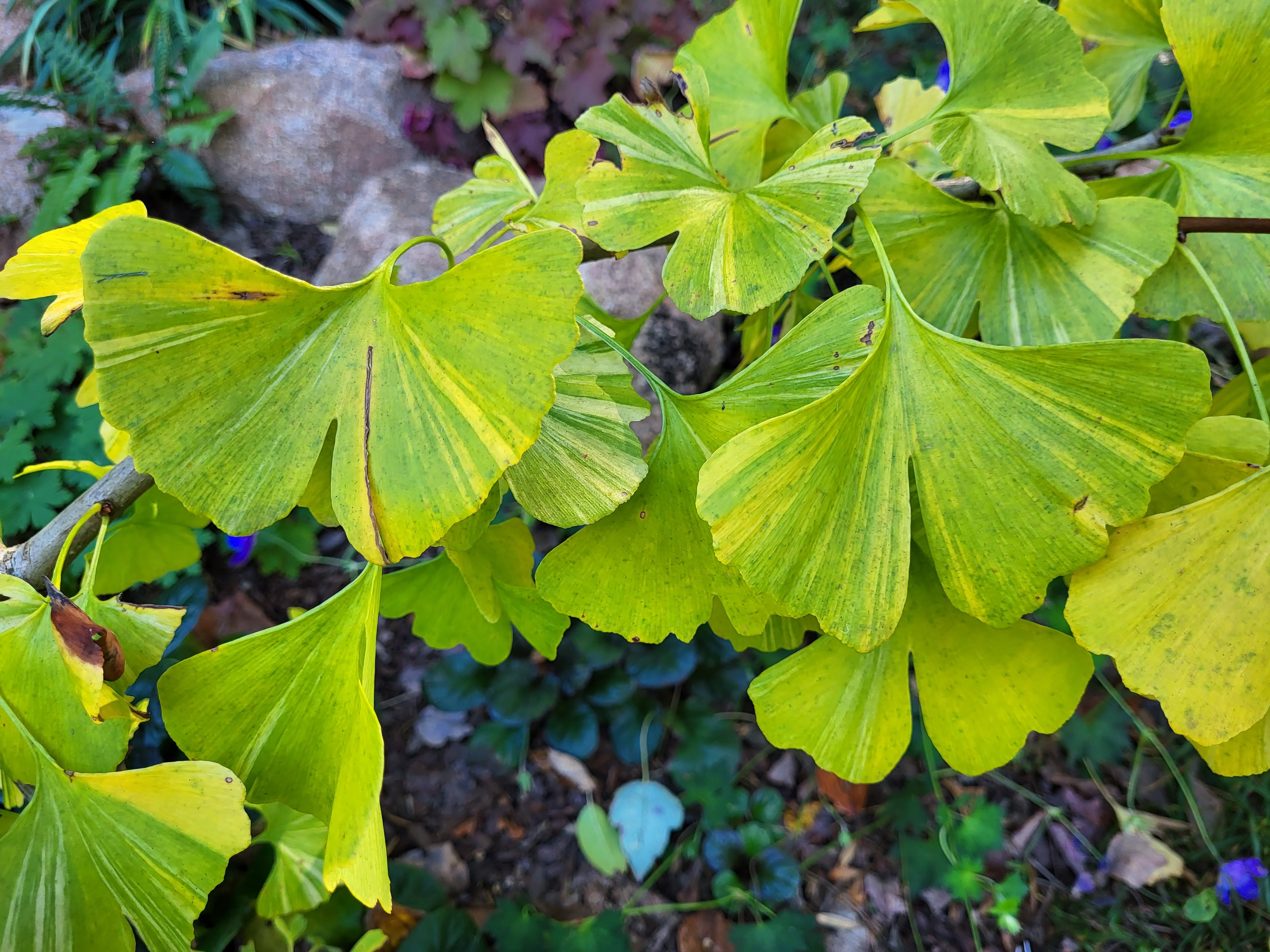 While Japanese maples are most numerous, there is more splendid foliage joining late flowering camellias and toad lilies, and berries on hollies and beautyberries. The recently expanded collection of ginkgo shows varying degrees of autumn foliage color depending on the tree’s sunlight exposure. Today, only the variegated ‘Majestic Butterfly’ (I think, below) begins to show the distinctive yellow that appears for only a few days before the leaves drop almost overnight. Other, slightly shaded ginkgoes remain green, but these will soon turn.