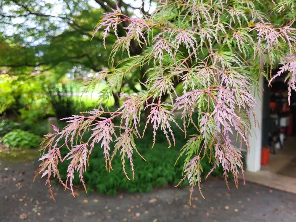 As I look from the kitchen window overlooking the rear garden, I am delighted that summer faded maples have turned again to red, but overhanging the front walk the lacy, green leaves of ‘Seriyu’ (Acer palmatum ‘Seriyu’, below) also turn to red. Visitors to the garden are often surprised to see such a large lace leafed Japanese maple the arches overhead along the front walk, and in its autumn color it is most remarkable.