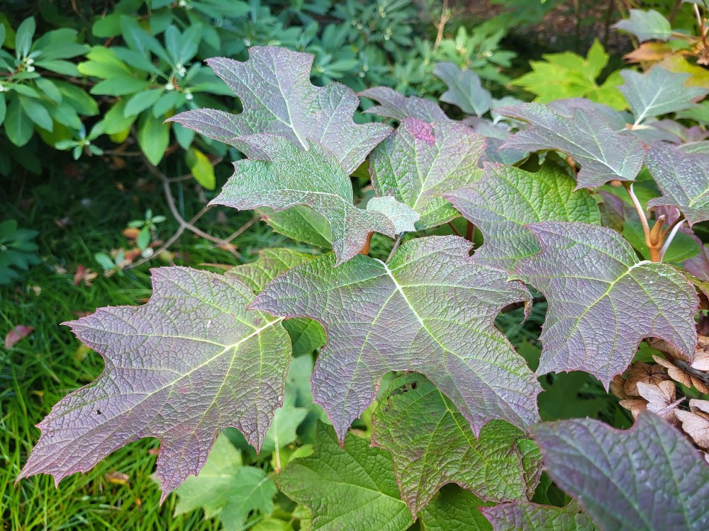 The autumn foliage of hydrangeas are often overlooked, but the oakleaf hydrangeas (Hydrangea quercifolia, below) stand out in the the garden. Ones in shade are late to color and occasionally these display little color, but ones in part sun are brilliant with leaves that often persist into the new year.