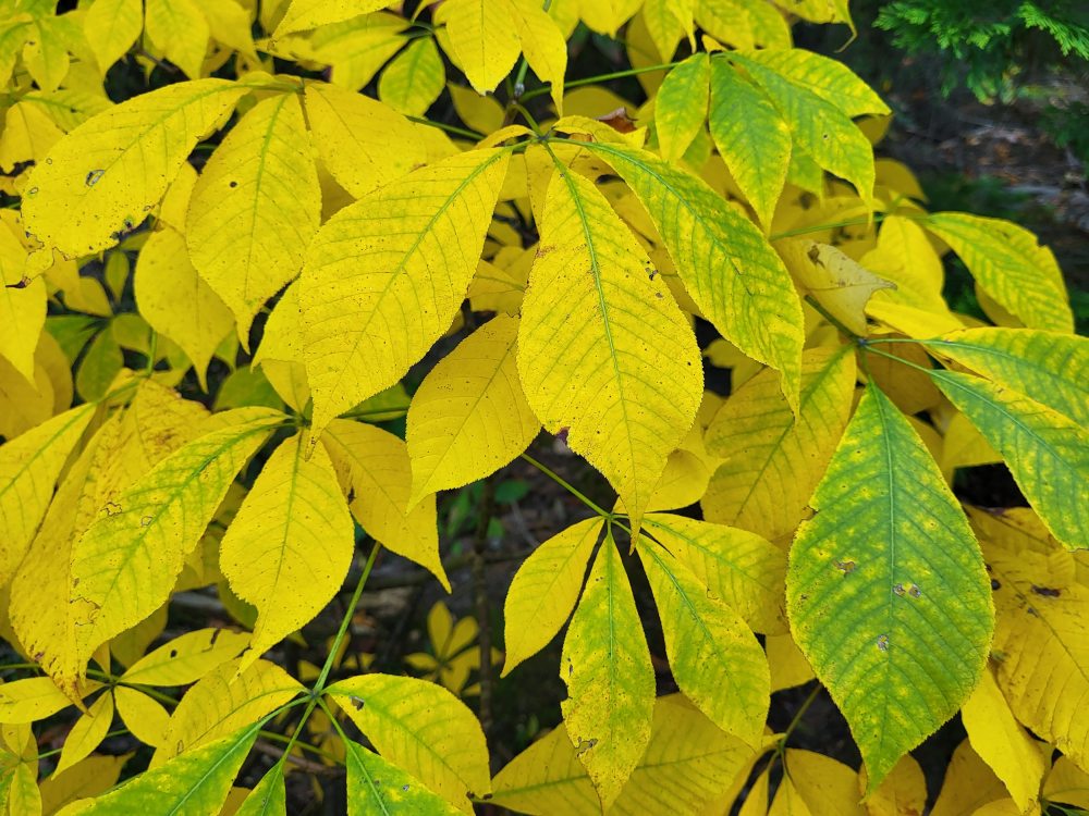 I am often conflicted in my regard for trees with yellow autumn foliage. There is a line below which yellow looks sickly, but above this point yellow can stand out even amongst other yellows. The bottlebrush buckeyes (Aesculus parvilfora, below) flash neon in the shade. Certainly, a visitor would inquire “what is that”?