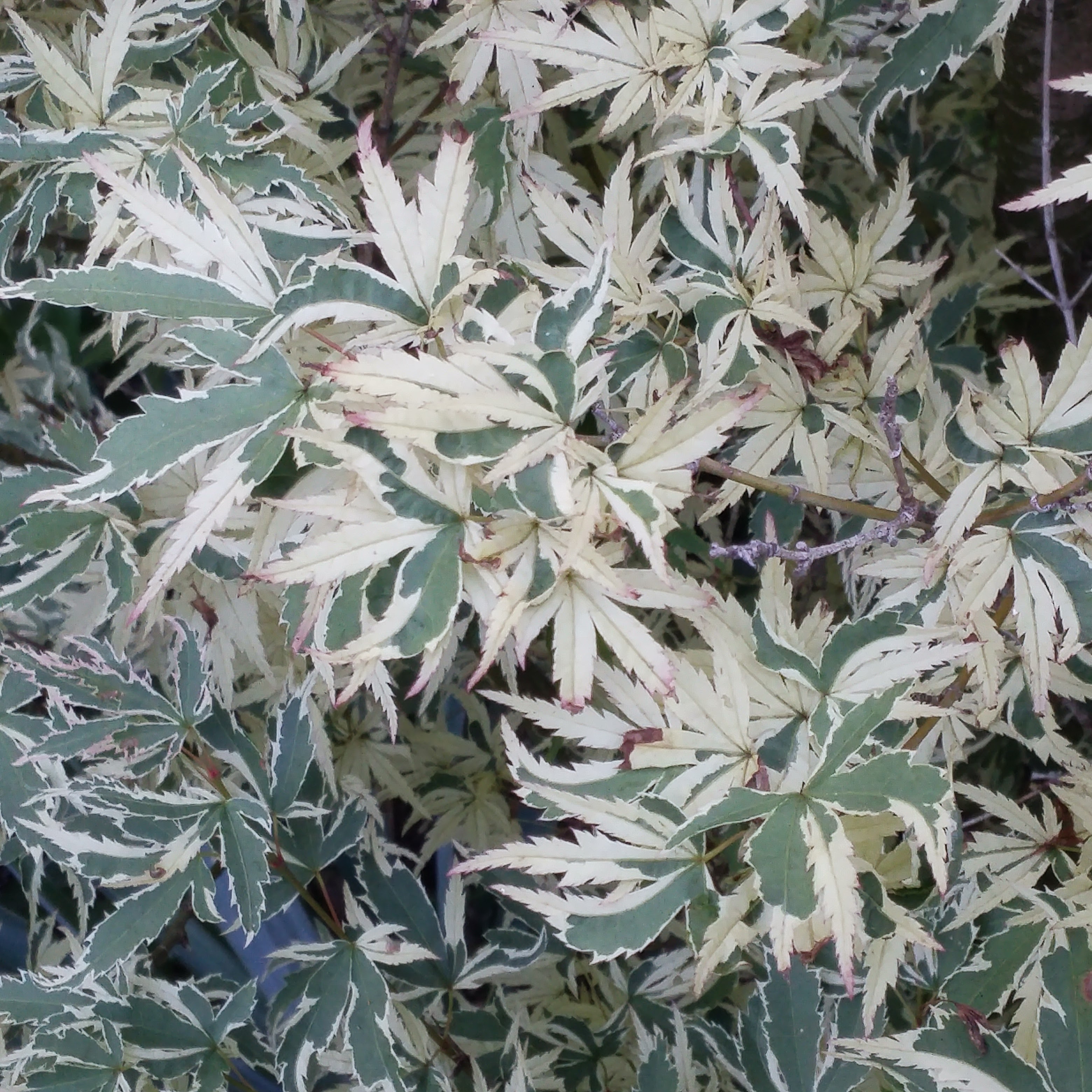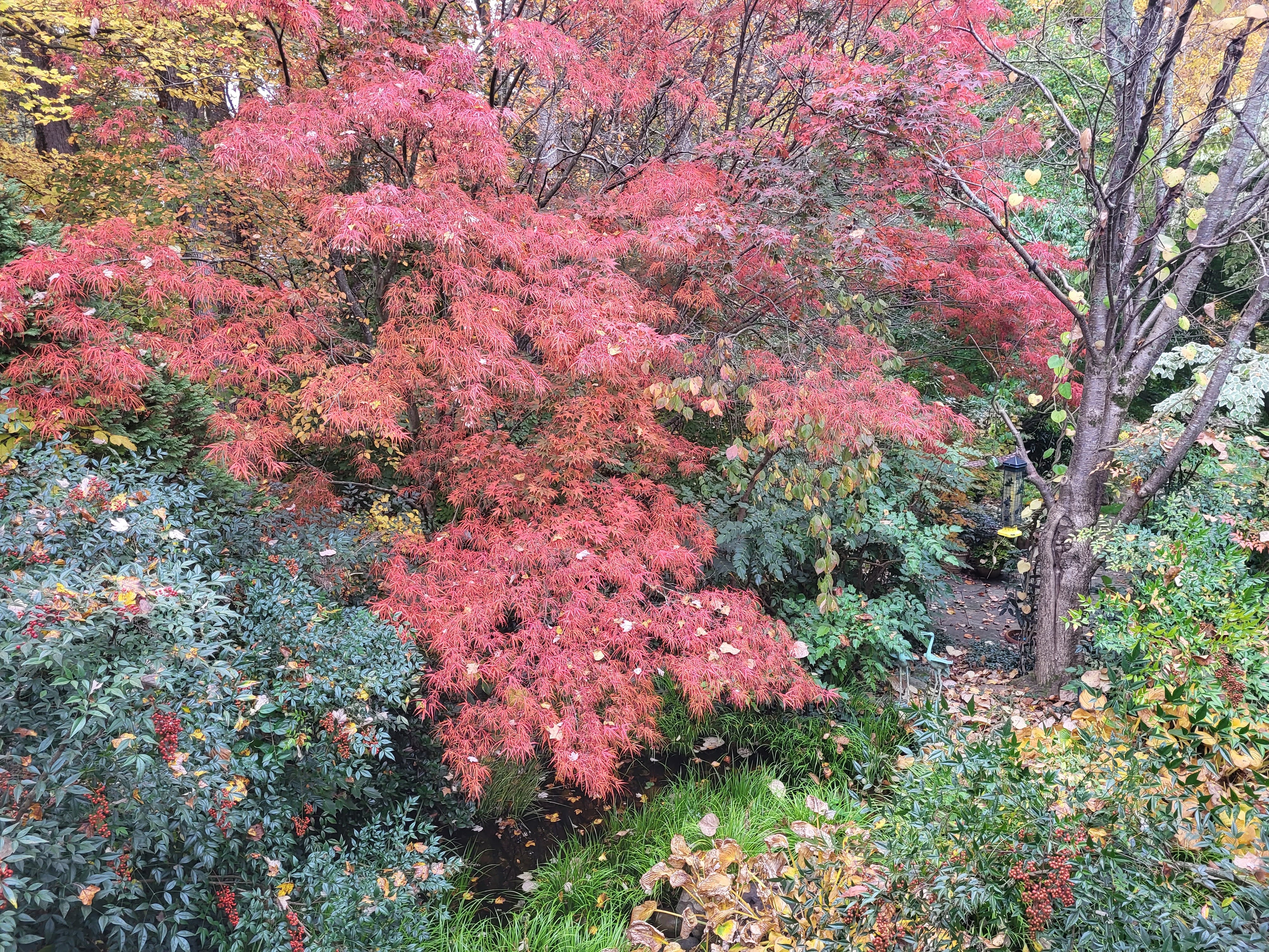 The immediate priority in reworking this space was to remove a tall nandina with arching stems that blocked the view of a portion of the upper level of the two level pond just below the sunroom. This was accomplished a few days ago since the space is just beyond the area needed for access, and a short but densely branched ‘Butterfly’ Japanese maple (below) was planted in its place. ‘Butterfly’ grows slowly, as I’ve seen from another in the garden, so I have no concern that it will impede the view.