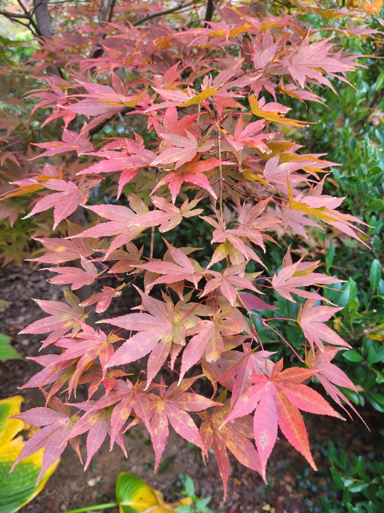 As autumn progresses, leaves of one Japanese maple after another fall as another comes into brilliant color. Alas, at the start of November the numbers with foliage remaining are diminishing as leaves pile to cover much of the garden.